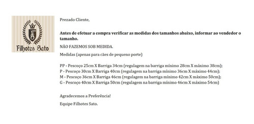 Guia Peitoral Dog Mario (com regulagem na barriga) acompanha guia. *ATENÇÃO* Antes de efetuar a compra verificar as medidas dos tamanhos abaixo! Medidas (apenas para cães de pequeno porte) PP - Pescoço 25cm X Barriga 34cm (regulagem na barriga mínimo 28cm X máximo 38cm); P - Pescoço 30cm X Barriga 40cm (regulagem na barriga mínimo 36cm X máximo 44cm); M - Pescoço 36cm X Barriga 46cm (regulagem na barriga mínimo 42cm X máximo 50cm); G - Pescoço 40cm X Barriga 50cm (regulagem na barriga mínimo 46cm X máximo 54cm) Guia bordada, velcro e click de segurança, acompanha Guia, Não Acompanha Boné! Nossos produtos são artesanais, por esse motivo, podem conter pequenas variações de tamanho.