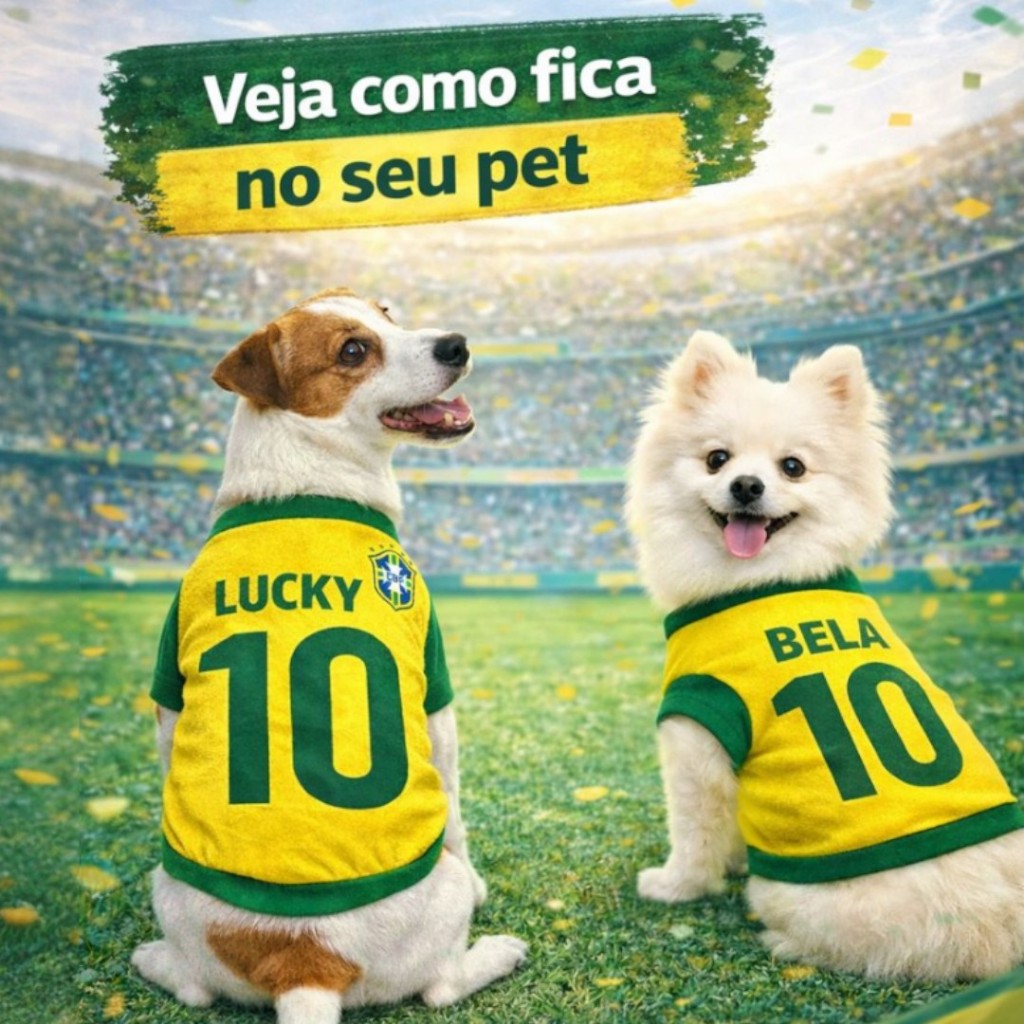 Roupa Pet do Brasil Personalizada com nome Verde e Amarela. Deixe seu pet mais estiloso com esta roupa do Brasil nesta Copa 2026, nas cores verde e amarela, personalizada com nome, perfeita para momentos especiais, comemorações e eventos esportivos. Produzida com tecido confortável e leve, oferece ótimo caimento e liberdade de movimento, garantindo bem-estar para o seu pet durante o uso. Além disso, o modelo permite personalização com o nome do pet e número, tornando a peça exclusiva e cheia de personalidade. - Destaques do produto: • Roupa Brasil nas cores verde e amarela • Personalização com nome da sua escolha • Tecido macio, leve e confortável • Não limita os movimentos do pet • Ideal para fotos, passeios e eventos • Acabamento reforçado e ótimo caimento - Personalização: Após a compra, informe o nome do pet e o número desejado no campo de mensagem ao vendedor ou pelo chat. - Tamanhos: Disponível em diversos tamanhos. Antes da compra, consulte a tabela de medidas nas imagens do anuncio para escolher o tamanho ideal. - Indicação: Indicado para cães de pequeno, médio e grande porte. - Observações importantes: • Produto de uso pet • As cores podem variar levemente conforme a iluminação da foto • Produto personalizado, produzido conforme as informações enviadas pelo comprador