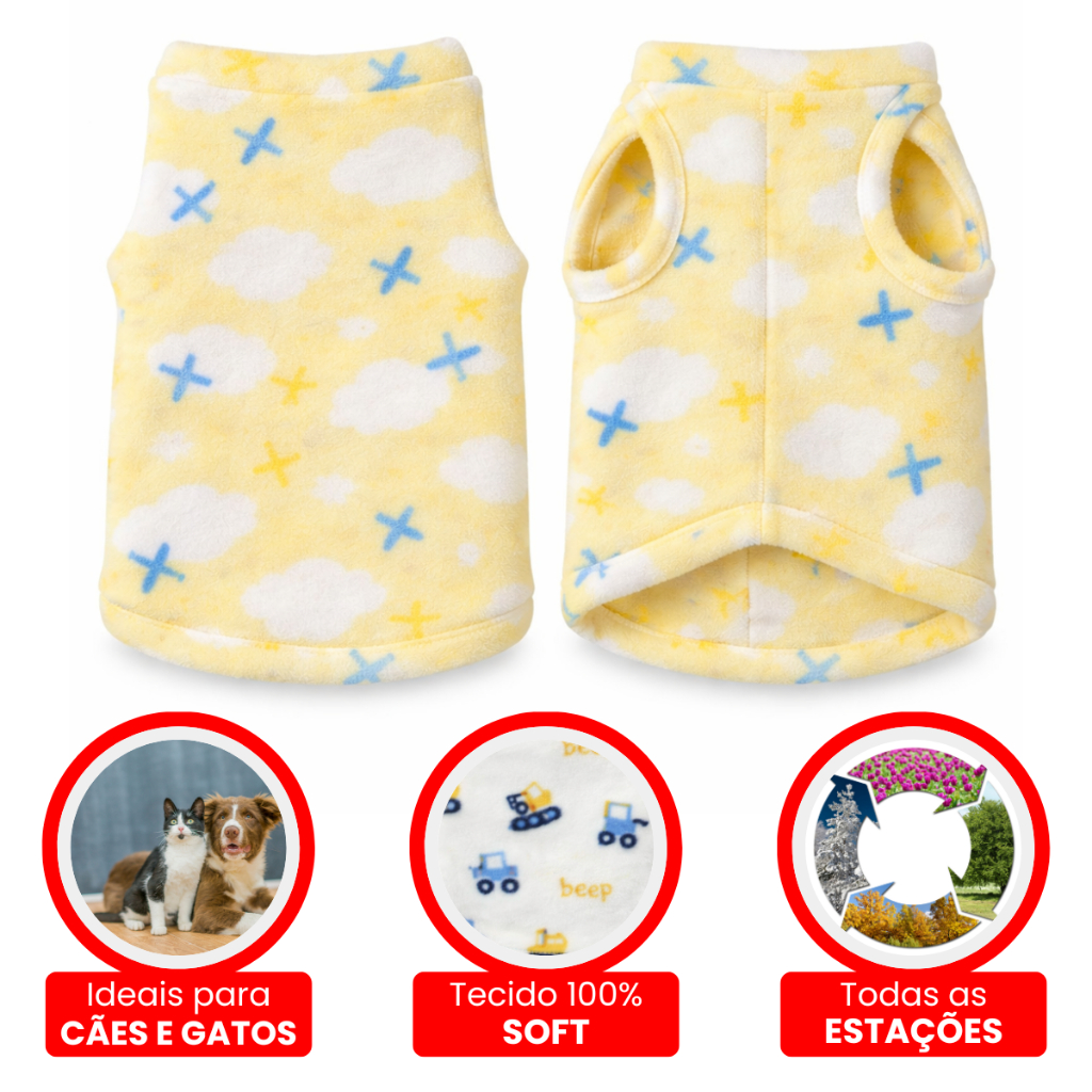 Roupa Roupinha Pet Para Cães e Gatos 100% Sóft Super Leve Para Todas As Estações *ATENÇÃO, IMAGENS MERAMENTE ILUSTRATIVAS, NOSSOS TECIDOS SÃO FEITOS EM SOFT SUPER LEVE* Nossas roupinhas pet são de ótima qualidade e feito com todo amor, carinho e dedicação para oferecer o melhor para seu bichinho de estimação. Produzidas especialmente por nós, proporcionamos não somente conforto mas também elegância para seu pet. Feito em tecido Soft, super leve e confortável. Ideal para todas as estações do ano, seu pet pode se sentir confortável em qualquer lugar! Ficha técnica: - Tecido: Soft - Estampa: Pode variar de acordo com a cor escolhida - Cores disponíveis: Amarelo com nuvens, Cinza com submarinos, Branco com caminhões, Rosa com coelhinhos e Vermelhos com ursinhos. - Tamanho: Nosso tamanho vai do 1 ao 8, verifique a tabela de medidas antes da sua compra! Itens que acompanha o anúncio: - 1 Roupinha Pet Para Cães e Gatos