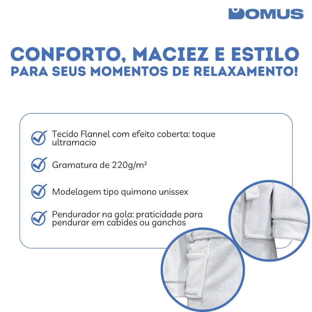 PRODUTO PRONTA ENTREGA COM ENVIO IMEDIATO Roupão Neo Velour Microfibra Adulto P Extra Macio Unissex – Camesa | Toque de aconchego, conforto e praticidade para seus dias Descrição do produto O Roupão de Microfibra Neo Velour da Camesa é perfeito para quem busca conforto, maciez e aquecimento nos dias mais frios. Fabricado em tecido Flannel com gramatura de 220g/m², oferece toque ultra macio, efeito coberta e sensação de aconchego imediato. Possui modelagem quimono com mangas longas, faixa para amarração, bolsos frontais e pendurador na gola, garantindo praticidade no uso diário. Destaques do produto Tecido Flannel com gramatura de 220g/m² que proporciona efeito coberta, mais maciez e aquecimento Modelagem quimono com mangas longas, ideal para conforto em dias frios Faixa para amarração na cintura e bolsos frontais que oferecem praticidade e funcionalidade Pendurador na gola que facilita o armazenamento no banheiro ou closet Informações técnicas Comprimento: 115 cm Largura dos ombros: 50 cm Largura da manga: 24 cm Largura do peito: 59 cm Material: 100% poliéster – tecido Flannel Gramatura: 220 g/m² Tamanho: P Cor: não informado (consultar disponibilidade) Conteúdo da embalagem 1 roupão Neo Velour microfibra tamanho P Produto original com garantia Garantia de 90 dias O aconchego que você merece, com conforto e suavidade para todas as estações.