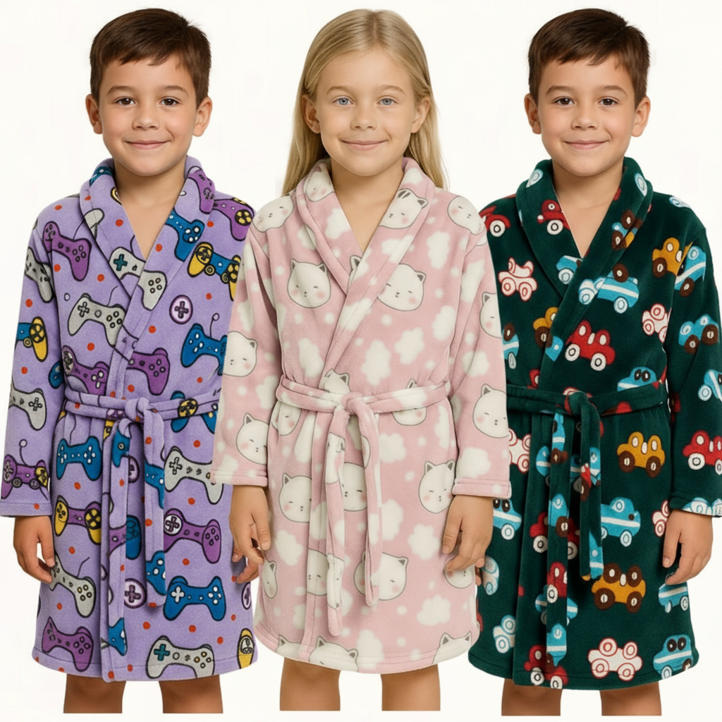 Este roupão infantil é a combinação perfeita de conforto, fofura e estilo para os pequenos. Feito em tecido fleece de toque macio e aveludado, proporciona aconchego e proteção ideal para os dias mais frios, sem pesar ou irritar a pele. Modelagem: Tradicional, com comprimento médio, — perfeito para garantir mobilidade e conforto. Fechamento: Faixa para amarrar na cintura, no mesmotecido e estampa do roupão, permitindo ajuste conforme o corpo da criança. além de maior conforto na região do pescoço. Mangas: Compridas e com modelagem reta, oferecendo liberdade de movimento. Indicação Ideal para meninos e meninas, especialmente em dias frios ou para usarapós o banho, antes de dormir ou nas manhãs de inverno. Cuidados Lavar à mão ou em ciclo delicado. Evitar alvejantes e secadora. Passar somente se necessário, em temperatura baixa.