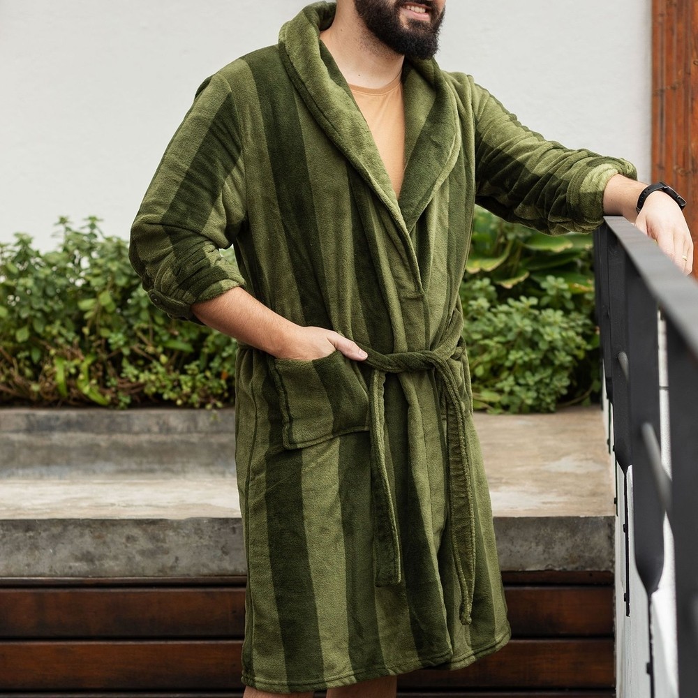 Perfeito para você presentear ou simplesmente curtir um momento relax, nosso Roupão Verde Militar Vários Nadas chegou trazendo conforto e muito estilo para a sua rotina! Todo listrado em tons de verde militar e contando com uma textura super macia, ele traz 2 bolsos, 1 faixa para amarrar na cintura e 1 alça interna para que você possa pendurá-lo no dia a dia. Com certeza, ele é a opção certa para você ficar em casa fazendo aquilo que mais gosta: Vários nadas. Contém 1 roupão. Tecido: 100% poliéster. Tamanho: úNico. Lavar à mão. Secagem em varal à sombra. Lavar separadamente. Não deixar de molho. Dimensões: Comprimento total: 1,10 m Largura da frente: 43,5 cm Comprimento da Manga: 65 cm Manga dobrada: 46 cm Teme químicos e abrasivos. Validade indeterminada.