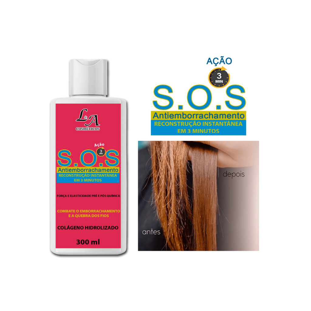 conteúdo : S.O.S Antiemborrachamento Reconstrução Instantânea em 3 minutos 300ml O Reconstrutor SOS Antiemborrachamento é um produto de ação rápida que, em apenas 3 minutos, transforma cabelos emborrachados em fios mais saudáveis. Isso é possível graças à tecnologia exclusiva desenvolvida pela L&A Cosméticos que torna os fios mais fortes, macios, brilhantes e saudáveis. Indicação: Recomendado para todos os tipos de cabelo, especialmente os emborrachados, ressecados e quebradiços. Modo de uso: Com os cabelos limpos e úmidos, aplique o SOS Antiemborrachamento em toda a área danificada, distribuindo suavemente com um pente até que o produto seja completamente absorvido; Deixe agir por 5 minutos; Penteie novamente e enxágue; Finalize conforme desejado.