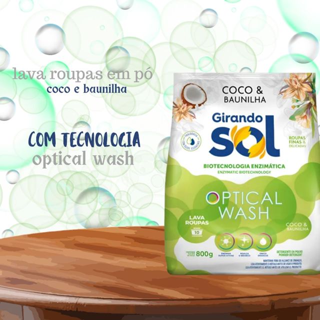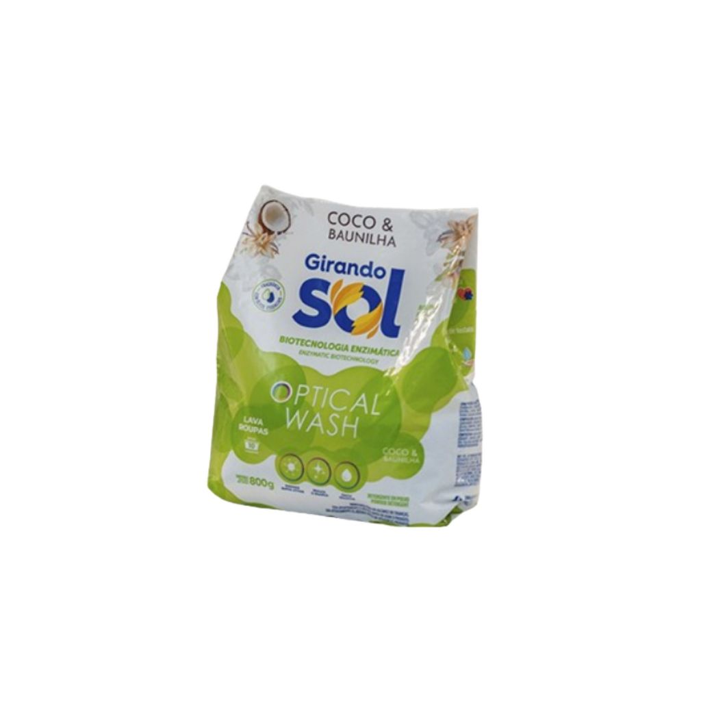 Sabão em Pó 800g; Possui uma exclusiva biotecnologia enzimática, que realça o branco e remove manchas sem desgastar as fibras dos tecidos; Conta com as enzimas superativas, remove manchas e os odores das peças. 800 gramas rende até 10 lavagens; Aroma Coco Baunilha; Os produtos Girando Sol não tem suas fórmulas testadas em animais. Demais produtos que compõem a foto não acompanham o sabão em pó.