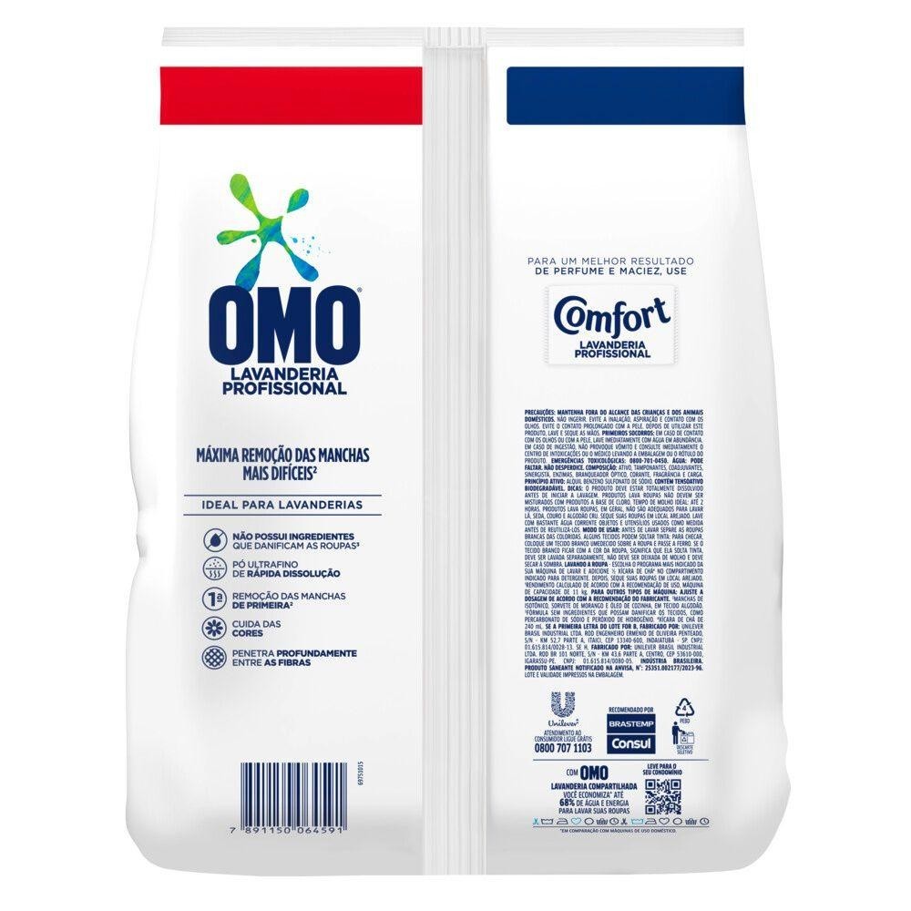• OMO Pro Lavanderia Profissional deixa as suas roupas impecáveis, removendo as manchas de primeira** • A fórmula do sabão em pó OMO possui um pó ultrafino de rápida dissolução, que não deixa resíduos, e não possui ingredientes que danificam as roupas*** • O detergente OMO penetra profundamente entre as fibras para máxima remoção das manchas mais difíceis** • O Sabão em pó OMO não desgasta os tecidos, cuidando das suas roupas, mesmo as mais delicadas • OMO Lavanderia Profissional cuida das cores sem danificar os tecidos, deixando suas roupas incrivelmente limpas • Lava roupas com tecnologia codesenvolvida com OMO Lavanderia Compartilhada você economiza***** até 68% de água e energia ao lavar roupas O Sabão em Pó OMO Pro Lavanderia Profissional possui uma Tecnologia codesenvolvida com OMO Lavanderia Compartilhada com máximo poder da limpeza para roupas incrivelmente limpas e cuidadas. Sua fórmula possui um pó ultrafino de rápida dissolução que não deixa resíduos e penetra profundamente entre as fibras para remoção das manchas de primeira**. Este detergente em pó não possui ingredientes que danificam as roupas***, cuida das cores e não desgasta os tecidos. OMO Lavanderia Profissional é poderoso, 5,6 kg rende 462 kg de roupas impecáveis* e sem manchas**, ideal para lavanderias. *Rendimento calculado de acordo com a recomendação de uso. Máquina de capacidade de 11 kg. **Manchas de isotônico, sorvete de morango e óleo de cozinha, em tecido algodão. ***Fórmula sem ingredientes que possam danificar os tecidos, como percarbonato de sódio e peróxido de hidrogênio. ****Xícara de chá de 240 ml. *****Em comparação com máquinas de uso doméstico.