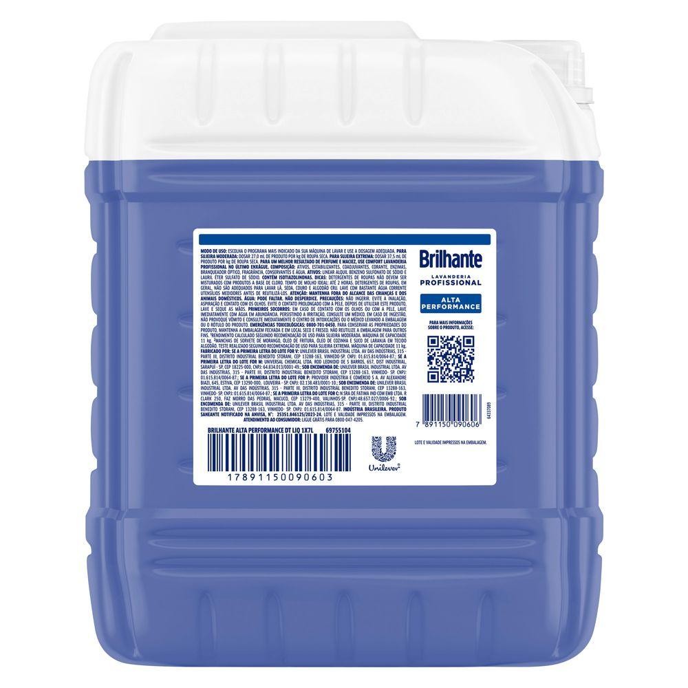 • O Sabão Líquido Brilhante Pro Alta Performance é um lava roupas para uso profissional, super eficaz na remoção de manchas de alimentos e gordura** • Desenvolvido com uma fórmula exclusiva de alta performance que remove as manchas mais difíceis das roupas do seu bar ou restaurante • Este sabão líquido Brilhante Pro, com a mesma tecnologia usada em lavanderia profissional, remove as manchas de primeira • Brilhante Pro Alta Performance 7 L rende 70 lavagens, o equivalente a 462 kg de roupas limpas* e sem manchas • Além de roupas limpas e sem manchas, possui em sua formulação branqueador óptico para roupas mais brancas • Sabão Líquido Brilhante Pro Alta Performance ideal para estabelecimentos Food Service como bares e restaurantes O Sabão Líquido Brilhante Pro Alta Performance é um lava roupas com uma fórmula superior desenvolvida exclusivamente para estabelecimentos Food Service, como bares e restaurantes. Esta fórmula de alta performance tem máxima eficácia na remoção de manchas de alimentos e gordura**. Super eficaz na lavagem de uniformes, toalhas de mesas e guardanapos, removendo as manchas de primeira. Brilhante Pro Alta Performance é um lava roupas líquido com tecnologia usada em lavanderia profissional. Sua embalagem de 7 L rende 70 lavagens, o equivalente a 462 Kg de roupas limpas* e sem manchas. Com branqueador óptico, para roupas ainda mais brancas e limpas em profundidade. Além disso, sua formulação contém tensoativos biodegradáveis, sendo menos agressivos para o ambiente. Para usar, escolha o programa mais indicado da sua máquina de lavar e adicione 100 ml no compartimento indicado para o detergente*. Produtos lava roupas não devem ser misturados com produtos à base cloro. Tempo de molho ideal: até 2 horas. O Sabão Líquido Brilhante Pro Alta Performance é o aliado perfeito na lavagem das roupas do seu bar ou restaurante. *Rendimento calculado de acordo com a recomendação de uso. Máquina de capacidade de 11 Kg. **Manchas de molho de tomate, suco de laranja, barbecue, shoyu e ganache de chocolate, em tecido algodão.