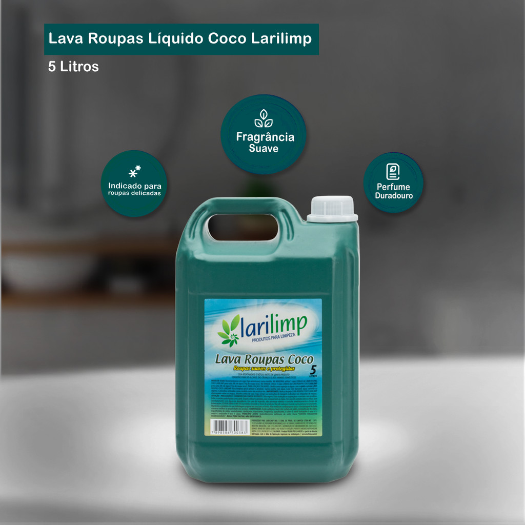 Lava Roupas Líquido Coco 5L Larilimp O sabão de roupa líquido Larilimp, traz tecnologia em sua formulação, removendo a sujeira sem agredir o tecido e fragrância com melhor fixação, mantendo suas roupas perfumadas por muito mais tempo. Indicado para roupas delicadas. Indicação de Uso: - Lavagem de roupas brancas e coloridas. Modo de Uso: - Utilize 1 copo americano (200ml) do produto em 20L de água; - Nunca aplicar diretamente nas roupas, sempre diluir primeiro. Cor: Branco Fragrância: Coco Embalagem: 01 galão de 5L