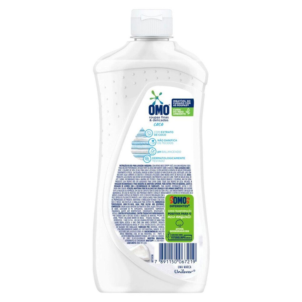 Sabão Líquido Omo Roupas Finas e Delicadas Coco 450ml - Imbatível na limpeza e cuida do meio ambiente. - Formulado para suas roupas delicadas durarem muito. - Com extrato de Coco. - Dermatologicamente testado. - Cuida das cores e dos tecidos. - Tampa com bico dosador para melhor manuseio. OMO Roupas Finas & Delicadas Coco foi pensado para as peças mais especiais. Sua fórmula hipoalergênica possui extrato do coco, cuidando das cores e dos tecidos mais delicados, enquanto remove as manchas sem danificar os fios, para que suas peças durem muito. Peças delicadas precisam de cuidado redobrado, por isso ele possui uma exclusiva tampa com bico dosador, o que facilita o uso para lavar as peças à mão ou para dosagem diretamente na máquina de lavar roupas. OMO Roupas Finas e Delicadas é imbatível na limpeza e cuida do meio ambiente, pois sua fórmula contém ativo biodegradável, além de economizar água, uma vez que precisa de apenas 1 enxágue. O plástico da sua garrafa é feito de outras garrafas e é 100% reciclável. Faça o descarte consciente. Quando você escolhe OMO, você escolhe um mundo melhor. Juntos, sOMOs a transformação positiva para o meio ambiente. - Compre produtos Omo.