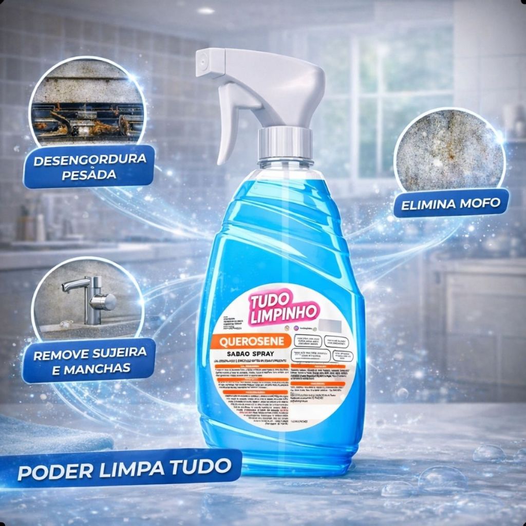 Sabão Spray Querosene – Limpeza Profunda – Deixa Tudo Limpinho e Brilhando – 500 ml O Sabão Spray Querosene 500 ml é um poderoso aliado na limpeza do dia a dia. Desenvolvido para oferecer alta eficiência na remoção de sujeiras e gordura, ajuda a deixar as superfícies limpas, brilhantes e com aparência renovada. Com aplicação prática em spray, o produto facilita o uso e permite uma limpeza rápida e eficiente em diversas superfícies. Sua fórmula auxilia na remoção de resíduos difíceis, proporcionando mais praticidade e economia de tempo nas tarefas domésticas. Ideal para uso em cozinhas, áreas de serviço, superfícies laváveis e outros ambientes da casa, o Sabão Spray Querosene se destaca pela sua ação eficiente e fácil aplicação. Características do produto: Conteúdo: 500 ml Tipo: sabão spray de limpeza Aplicação prática com borrifador Auxilia na remoção de sujeiras e gordura Proporciona brilho e limpeza eficiente Vantagens: Limpeza rápida e prática Ajuda a remover sujeiras difíceis Deixa as superfícies limpas e brilhantes Fácil aplicação com spray Ideal para limpeza do dia a dia Modo de uso: Borrife o produto diretamente na superfície desejada e espalhe com um pano, esponja ou flanela. Em seguida, finalize a limpeza até remover completamente o produto. Produto ideal para quem busca mais praticidade, eficiência e brilho na limpeza da casa.