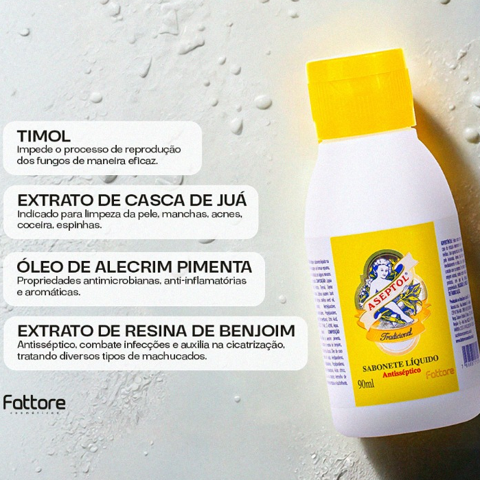 ✨ Sabonete Líquido Antisséptico Aseptol Tradicional – Limpeza Profunda e Refrescância Diária! 100% ORIGINAL ✨Higiene poderosa no seu dia a dia! O Aseptol Tradicional é um sabonete líquido antisséptico com eficácia comprovada para a limpeza das mãos e do corpo. Fórmula com viscosidade ideal, espuma suave e sensação refrescante após o enxágue. ✨Para casa ou para uso profissional! Perfeito para clínicas, consultórios, creches, hotéis, shoppings, indústrias e também para sua rotina diária no banho. Um produto versátil, seguro e com excelente rendimento. ✨Sensação de limpeza que você sente na hora! Deixa a pele limpa, fresca e com aquele aroma clássico inconfundível, que desperta memórias e sensação de conforto. ✅ Benefícios Ação antisséptica comprovada Limpeza profunda e refrescante Uso corporal e para mãos e pés Aroma tradicional marcante Ótimo rendimento Ideal para ambientes profissionais e uso doméstico Seguro e muito indicado para cuidados pós esportes como Beach Tênis, Futebol, Ciclismo ou Corrida!