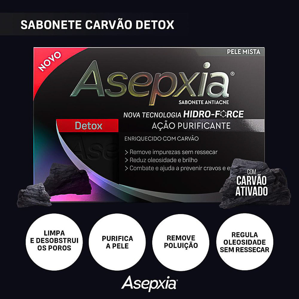 SABONETE ASEPXIA DETOX Sabonete Antiacne Pele Mista O novo Asepxia Sabonete Antiacne Detox limpa profundamente e purifica a pele sem ressecar, desobstruindo os poros e reduzindo cravos e espinhas com