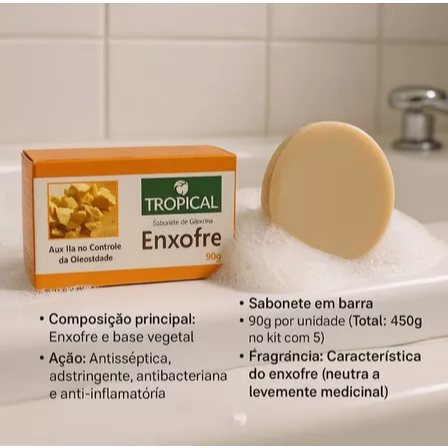 Sabonete de Enxofre – Cuidados Eficazes para a Pele e Couro Cabeludo Controle da oleosidade e saúde para sua pele! O sabonete de enxofre é um aliado poderoso no tratamento de peles oleosas e acneicas, oferecendo benefícios que ajudam a equilibrar, proteger e revitalizar a pele. Principais Benefícios ️ Controle da Oleosidade Excessiva: O enxofre atua como um seborregulador natural, equilibrando a produção de sebo pelas glândulas sebáceas. Isso ajuda a prevenir a obstrução dos poros e o surgimento de acne. ️ Redução e Prevenção da Acne: Com propriedades antimicrobianas, o sabonete combate bactérias causadoras de acne, criando um ambiente mais saudável para a pele. ️ Cuidado com o Couro Cabeludo: Ideal para tratar a oleosidade excessiva do couro cabeludo, auxiliando na prevenção de problemas como caspa e outros relacionados ao excesso de óleo. Cuidados no Uso ️ Ressecamento da Pele: O enxofre pode causar ressecamento. Para evitar, aplique um hidratante adequado após o uso para manter a pele hidratada e equilibrada. Modo de Uso Para a Pele: Umedeça a área desejada. Aplique o sabonete realizando movimentos circulares suaves. Enxágue bem. Para o Couro Cabeludo: Aplique diretamente no couro cabeludo molhado, massageando com delicadeza. Enxágue abundantemente. ⏰ Frequência Recomendada: Utilize de 2 a 3 vezes ao dia, dependendo da necessidade e tolerância da sua pele. Por que escolher o Sabonete de Enxofre? Um produto versátil, ideal para pessoas com pele oleosa e acneica, que também proporciona benefícios ao couro cabeludo. Com os cuidados corretos, é possível alcançar uma pele equilibrada, saudável e protegida. Descubra os resultados transformadores do sabonete de enxofre e cuide da sua pele com praticidade e eficiência!