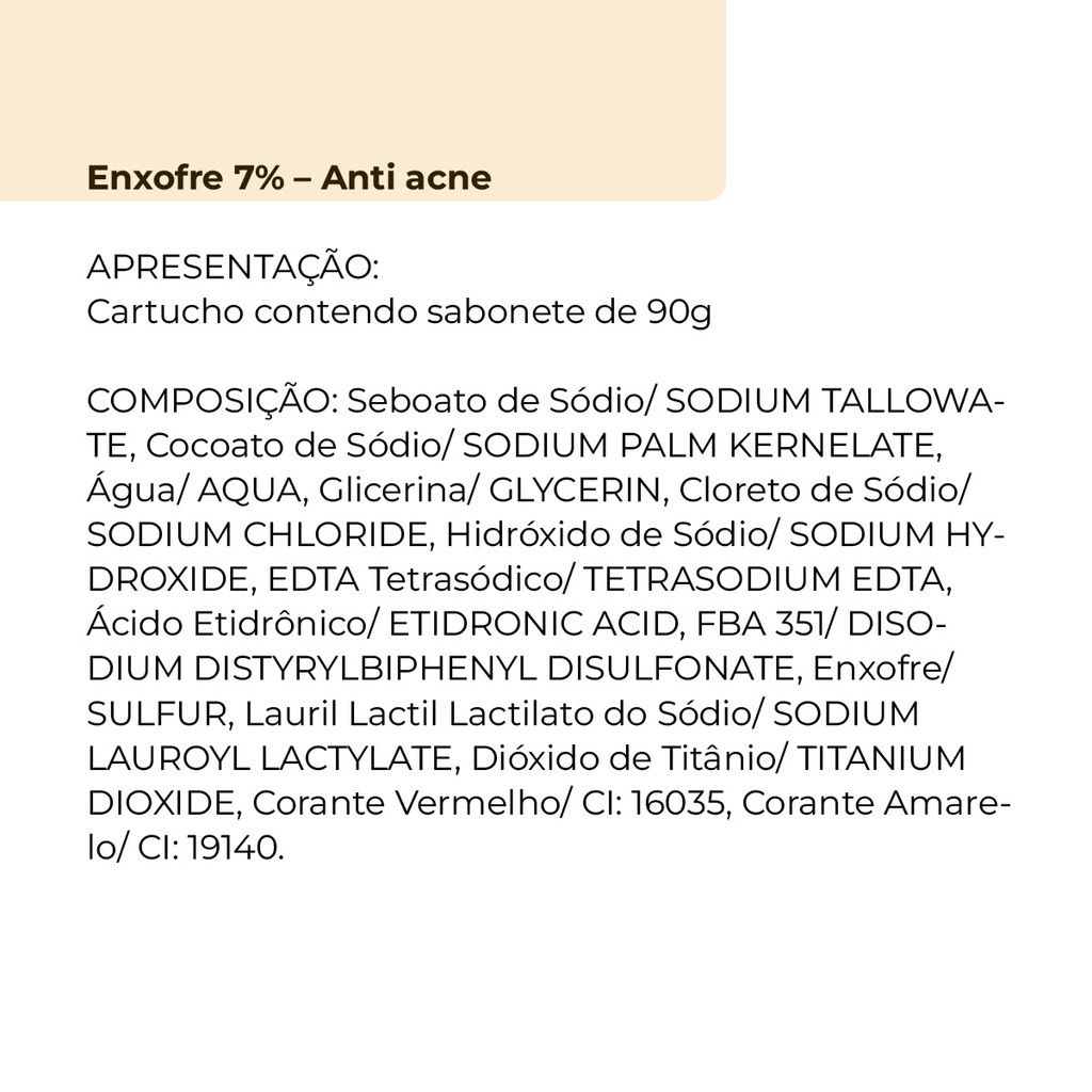 Sabonete de Enxofre Arte Nativa 90gr MODO DE USO: Umedeça a pele e aplique o sabonete de Enxofre na área afetada fazendo movimentos circulares com as mãos. Enxágue a área completamente. Repetir a aplicação 2 a 3 vezes ao dia. Para melhor resultado, recomenda-se o uso diário. FINALIDADE DE USO: Sabonete para pele Acnéica / Abrasivo/ Esfoliante químico. O sabonete de Enxofre auxilia no combate de cravos e espinhas eliminando o excesso de oleosidade. É Essencial para o cuidado diário da pele, pois apresenta em sua composição, 7% de enxofre além de elementos selecionados para o cuidado e limpeza da pele oleosa. Dermatologicamente testado. CUIDADOS DE CONSERVAÇÃO:Mantenha a embalagem bem fechada e ao abrigo do calor excessivo. ADVERTÊNCIAS: Para uso externo apenas. Não usar em crianças. Em caso de irritação, interromper o uso e consultar um médico. Aplicar apenas na área afetada. Mantenha fora do alcance de crianças. Em caso de contato com os olhos, enxágue abundantemente com água. Usar esse produto ao mesmo tempo ou após o uso de medicamento ou outros produtos para acne, pode aumentar a secura ou irritação da pele. Nesses casos, consulte um médico. Evitar exposição ao sol durante o uso (aconselhável o uso do protetor solar). COMPOSIÇÃO:Seboato de Sódio/ SODIUM TALLOWATE, Cocoato de Sódio/ SODIUM PALM KERNELATE, Água/ AQUA, Glicerina/ GLYCERIN, Cloreto de Sódio/ SODIUM CHLORIDE, Hidróxido de Sódio/ SODIUM HYDROXIDE, EDTA Tetrasódico/ TETRASODIUM EDTA, Ácido Etidrônico/ ETIDRONIC ACID, FBA 351/ DISODIUM DISTYRYLBIPHENYL DISULFONATE, Enxofre/ SULFUR, Lauril Lactil Lactilato do Sódio/ SODIUM LAUROYL LACTYLATE, Dióxido de Titânio/ TITANIUM DIOXIDE, Corante Vermelho/ CI: 16035, Corante Amarelo/ CI: 19140.