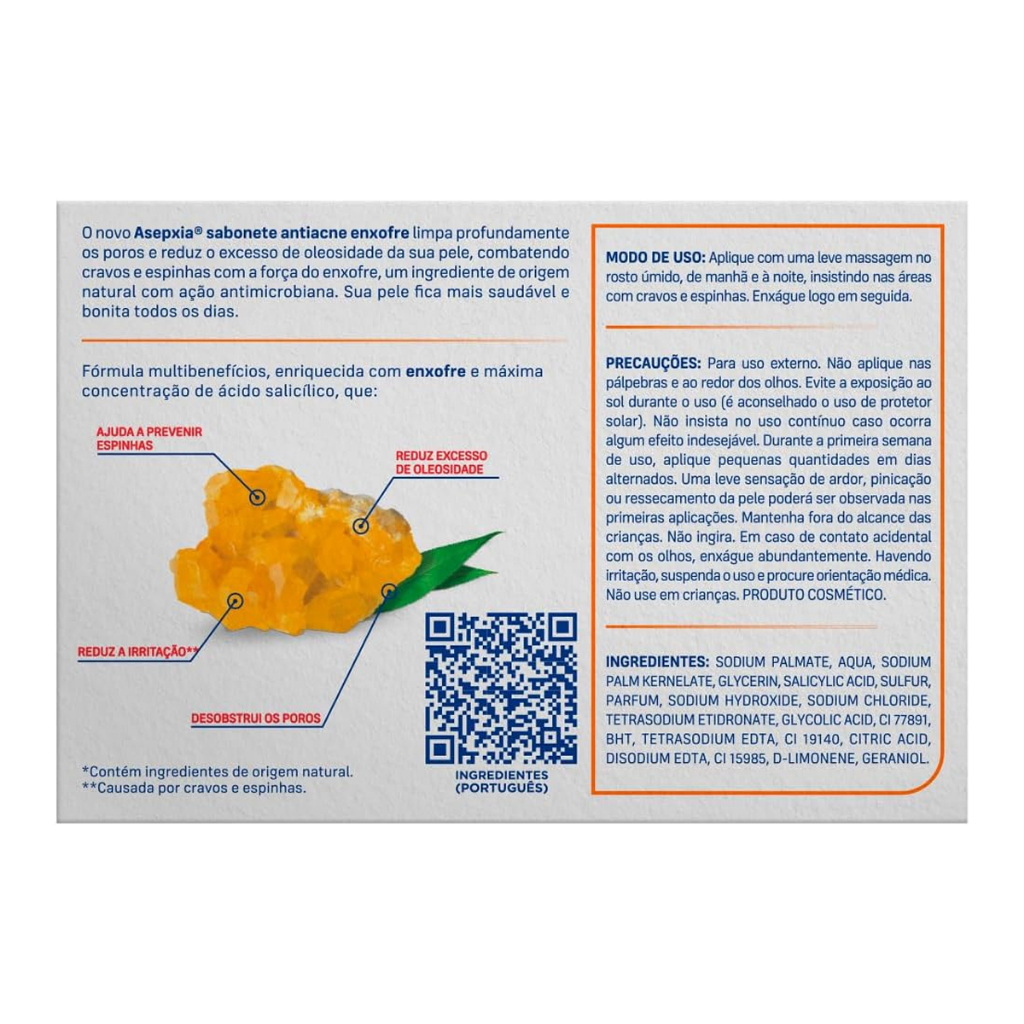 Sabonete Barra Asepxia Enxofre 80g Principais Características: • Fórmula enriquecida com enxofre, reconhecido por sua ação secativa e purificante. • Limpa profundamente os poros, auxiliando na remoção de cravos e espinhas. • Desenvolvido especialmente para peles oleosas e com tendência à acne. Benefícios: • Ajuda a controlar a oleosidade da pele. • Promove efeito secativo em espinhas e imperfeições. • Proporciona uma pele visivelmente mais limpa, saudável e uniforme. • Ideal para uso diário no cuidado com a pele acneica. Diferenciais do Produto: • A presença de enxofre na composição oferece ação antisséptica e secativa superior. • Produto dermatologicamente testado para segurança no uso frequente. • Textura sólida e prática para aplicar diretamente na pele. Especificações Técnicas: - Peso: 80g Instruções de Uso: - Aplique o sabonete sobre a pele úmida, massageando suavemente até formar espuma. - Deixe agir por alguns segundos e enxágue completamente. - Pode ser utilizado uma ou duas vezes ao dia, conforme a necessidade da pele ou recomendação médica. Avisos e Precauções: - Evite contato com os olhos. - Em caso de irritação, suspenda o uso e procure um dermatologista. - Mantenha fora do alcance de crianças. - Armazene em local seco e ao abrigo da luz e calor excessivo. O que está incluso? - 1 unidade de Sabonete Barra Asepxia Enxofre 80g ---- DÚVIDAS FREQUENTES ---- Os produtos são originais? Sim. Todos os nossos produtos são originais. Emitem nota fiscal? Sim. Emitimos nota fiscal para todos os pedidos.