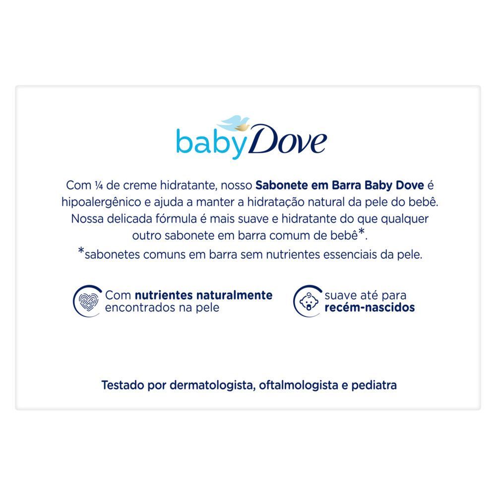 Sabonete em Barra Dove Baby Hidratação Enriquecida 75g• O Sabonete em Barra Baby Dove Hidratação Enriquecida é hipoalergênico e ajuda a manter a hidratação natural da pele do bebê • Sabonete em barra formulado sem corantes, parabenos, sulfatos ou ftalatos e testado por oftalmologista, dermatologista e pediatra • Sabonete hidratante feito com nutrientes naturalmente encontrados na pele e suave até para o primeiro banho do recém-nascido • O Sabonete em Barra Baby Dove Hidratação Enriquecida deixa a pele sensível do bebê limpa, macia e hidratada • Sabonete em barra Baby Dove feito com ¼ de creme hidratante • Nosso sabonete em barra para bebês possui uma fórmula mais suave e hidratante do que qualquer outro sabonete em barra comum de bebê* Feito com ¼ de creme hidratante, nosso Sabonete em Barra Baby Dove Hidratação Enriquecida é hipoalergênico e ajuda a manter a hidratação natural da pele do bebê. A hora do banho com seu bebê é especial, por isso sabemos que você quer o melhor sabonete para esse momento. Nossa delicada fórmula é mais suave e hidratante do que qualquer outro sabonete em barra comum de bebê*. Esse sabonete em barra ajuda a repor a hidratação e os nutrientes perdidos durante o banho, tem pH neutro e limpa delicadamente, deixando a pele sensível do bebê suavemente perfumada e macia. O Sabonete em Barra Baby Dove Hidratação Enriquecida é criado sem corantes artificiais, parabenos, ftalatos ou sulfatos e é testado por dermatologista, oftalmologista e pediatra. Suave e hidratante para a pele, esse sabonete para bebês é ideal para uso diário. Modo de uso: molhe a pele do bebê com água morna, massageie suavemente o produto no corpo do seu bebê, até fazer espuma. Enxágue em seguida. Após o banho, experimente também hidratar o corpo do seu pequeno pelo menos duas vezes ao dia, com um produto de fórmula suave e hipoalergênica, como a das Loções Baby Dove. *Sabonetes comuns em barra sem nutrientes essenciais da pele.
