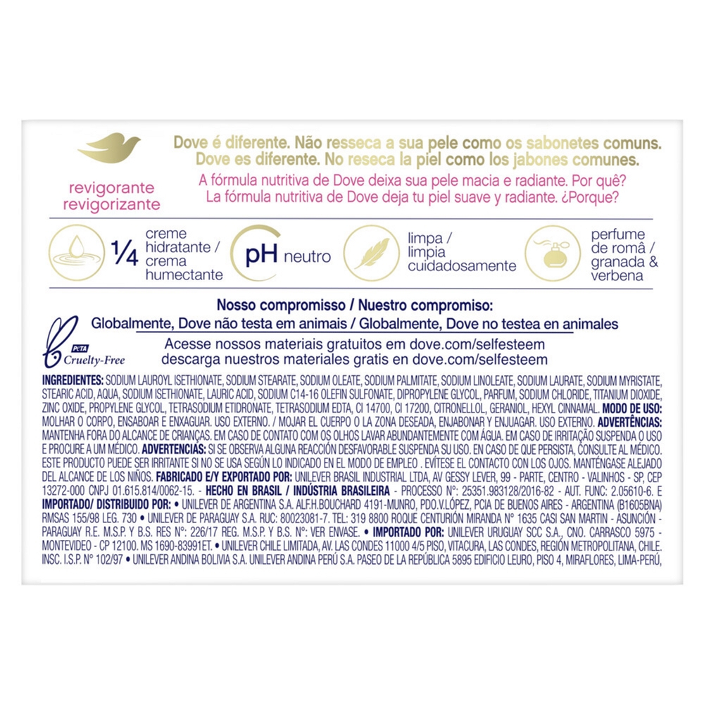 Com 1/4 de creme hidratante e agentes de limpeza suaves, Dove ajuda a proteger a hidratação natural da pele. Dove não resseca a pele como sabonetes comuns. Fragrância refrescante de romã e verbena. Nenhum sabonete em barra comum hidrata a pele melhor do que Dove. Pode ser usado diariamente no rosto, mãos e corpo. Deixa a pele macia, bem cuidada e com aspecto saudável. Dove não é um simples sabonete em barra comum. É um sabonete de beleza feito com tecnologia Syndet que vai além da limpeza, nutrindo a pele conforme remove a sujeira do dia a dia. O Sabonete Dove Go Fresh Revigorante Romã e Verbena promove um despertar suave para sua mente e pele. Você se pergunta sobre como refrescar a sua pele e mantê-la macia e nutrida ao mesmo tempo? O banho é um ótimo momento para começar o dia com mais frescor, e por isso criamos o Sabonete Dove Go Fresh Revigorante Romã e Verbena. Com 1/4 de creme hidratante e agentes de limpeza suave, esse sabonete ajuda a repor nutrientes naturais da pele que são perdidos durante o banho e ajuda a pele a manter sua hidratação natural, além de trazer uma sensação de frescor com o aroma vívido da romã. Basta esfregar o Sabonete Dove Go Fresh Revigorante Romã e Verbena entre as mãos e massagear a espuma cremosa e rica por toda a pele antes de enxaguar. O Sabonete Dove Go Fresh Revigorante Romã e Verbena é dermatologicamente recomendado. Você pode ser fã do Sabonete Dove Go Fresh Revigorante Romã e Verbena, mas com tantas opções, por que não experimentar todos? Afinal, temos um sabonete para cada momento.