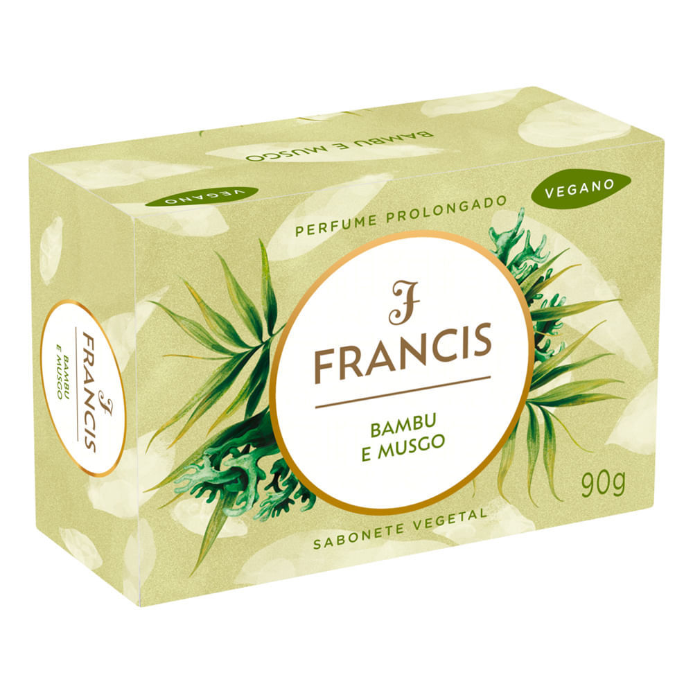 Sabonete Barra Vegetal Bambu e Musgo Francis Descubra a fórmula inovadora do Sabonete Vegetal Francis, enriquecido com a deliciosa fragrância de bambu e musgo. Este sabonete não só proporciona uma li