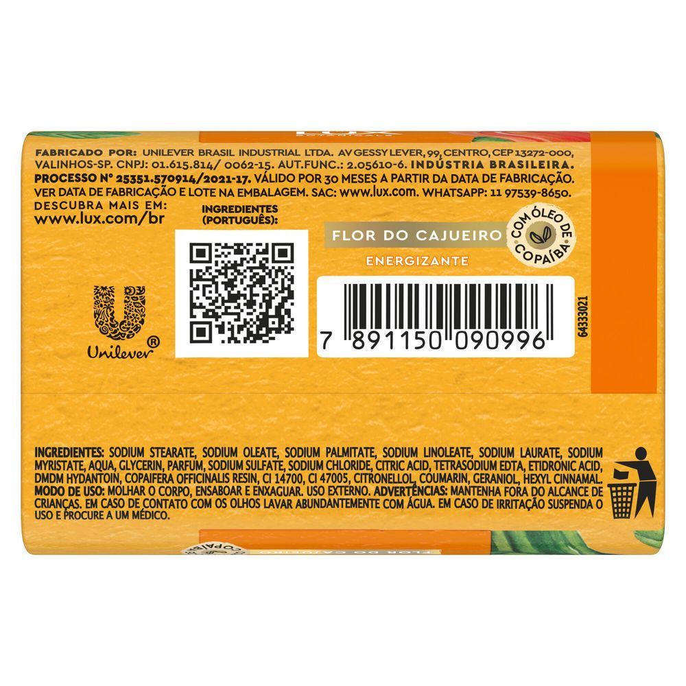 • O sabonete em barra Essências do Brasil por Lux Botanicals Flor do Cajueiro possui uma fragrância única que revitaliza corpo, mente e alma • Sua fórmula contém glicerina e óleo de copaíba, ingredien