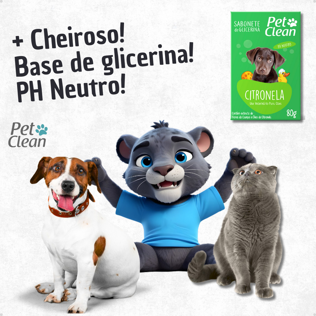 Sabonete para a limpeza do seu pet! Cachorros e gatos limpos e cheirosos são grandes desejos de todos os amantes de animais, não é mesmo? Às vezes ficamos perdidos, entre tantas opções. O Sabonete para Cães e Gatos da Pet Clean garante um banho com alto poder de limpeza de maneira segura e agradável para o seu pet! Benefícios do Sabonete da Pet Clean: Limpa e cuida dos pelos. pH neutro Não agride o animal. Indicado para todos os tipos de cães e gatos. Pelos macios e cheirosos. Itens Inclusos: 1x Sabonete Neutro para Cães e Gatos Pet Clean - 80g (escolher entre: Citronela, Coco, Natural ou Neutro) MODO DE USAR Aplique o sabonete no seu pet ainda molhado e massageie por toda a pelagem até que se forme espuma. Deixe agir por alguns minutos e enxágue bem. PRECAUÇÕES Evite contato com os olhos e mucosas do animal. Manter longe de alimentos e produtos domésticos. Manter em locais secos, fora do alcance de crianças e animais domésticos. Não utilizar em filhotes com menos de 2 meses de vida. PERGUNTAS FREQUENTES POSSO USAR O SABONETE EM FILHOTES? Sim! Desde que o filhote tenha mais de 3 meses de vida. O SABONETE É APLICADO DA MESMA FORMA PARA CÃES E GATOS? Sim! A aplicação é a mesma para ambos animais. O QUE FAZER SE O SABONETE TOCAR OS OLHOS? Se o sabonete vier a tocar os olhos, recomendamos que enxágue com água em abundância. O sabonete tem pH neutro, o que não será danoso aos olhos do animal. No entanto, recomendamos sempre evitar o contato do produto com os olhos. POSSO USAR CONDICIONADOR DEPOIS DE USAR O SABONETE? Sim! Você pode usar o condicionador que desejar! Informações Técnicas: Produto: Sabonete Neutro para Cães e Gatos Pet Clean - 80g Marca: Pet Clean Tipo: Higiene Animal: Cachorros e Gatos Porte: Pequeno, Médio e Grande. Acima de 3 meses. Raça Específica: Todas Apresentação: Caixa Composição: Base Glicerinada, Bataína, Fragrância e Extratos.