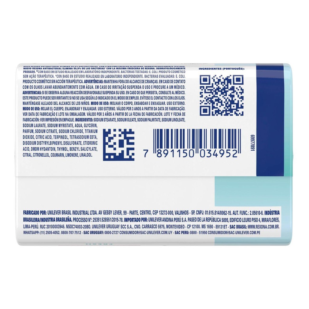 • O sabonete em barra Rexona Antibacteriano Fresh tem uma fórmula exclusiva, garantindo proteção eficaz e uma pele suave • Desenvolvido com tecnologia antibacteriana, sua fórmula elimina até 99,9% das bactérias* higienizando sua pele e deixando-a livre de germes • Com glicerina, muito conhecida como um ingrediente hidratante para a pele, proporcionando um toque suave no banho • Combinação exclusiva de ingredientes que entregam benefícios de limpeza e refrescância, com pH adequado, sem ressecar ou remover a camada protetora de sua pele • Este sabonete em barra promove sensação de frescor prolongada com notas frutais cítricas • Dermatologicamente testado, entrega uma limpeza profunda, hidratação e perfume na medida certa Os sabonetes em barra de Rexona possuem uma combinação exclusiva de ingredientes que, em conjunto, entregam benefícios de limpeza profunda e refrescância além de deixar sua pele suave. Nossa fórmula antibacteriana elimina até 99,9% das bactérias* proporcionando uma sensação revitalizante, de refrescância prolongada e limpeza profunda. O sabonete em barra Rexona Antibacteriano Fresh limpa sem ressecar a pele. Dermatologicamente testado, apresenta um pH adequado, promovendo uma limpeza eficaz sem ressecar ou remover a camada protetora da sua pele. Limpeza profunda, hidratação na medida certa com notas frutais cítricas. Todas as variantes de Rexona são exclusivamente formuladas para proporcionar uma sensação única de refrescância durante e após o banho, para você sentir suas energias recarregadas. Além disso, apresentam um toque suave no banho, pois contém glicerina na fórmula, um ingrediente conhecido pelo seu poder de hidratação para a pele. Os sabonetes em barra Rexona têm variantes que proporcionam sinergia com os antitranspirantes. Maximize a sensação de refrescância utilizando Rexona Antitranspirante Active Dry e sinta-se protegido durante o dia todo. Dentro ou fora de casa, Rexona sempre está presente para garantir que sua pele esteja livre de bactérias. *Com base em estudo realizado em laboratório independente. Bactérias testadas: Staphylococcus Aureus. Produto cosmético sem ação terapêutica.