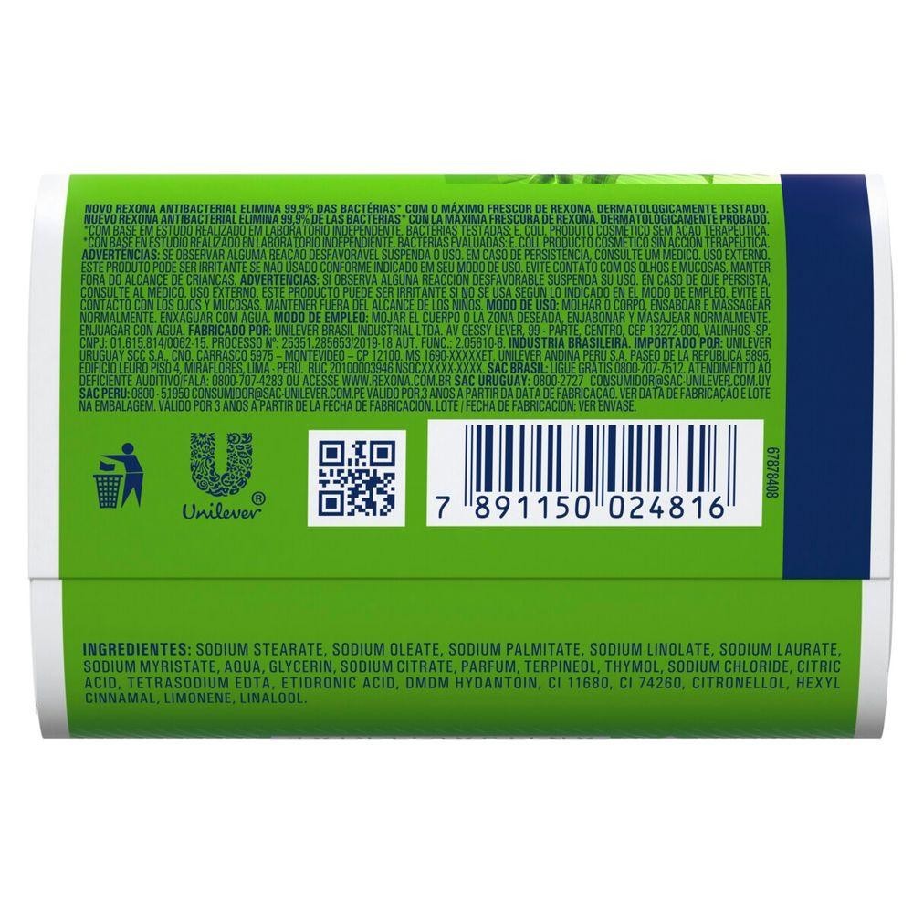 • Possui uma fragrância que mistura os deliciosos aromas florais de lavanda e rosa, com notas vigorosas cítricas de limão e laranja; • Com nova tecnologia os sabonetes Rexona Antibacterial eliminam até 99,9% das bactérias* e o vírus da COVID-19**; • Sensação única de refrescância durante e após o banho, para você sentir suas energias recarregadas; • Um toque suave no banho, pois contém glicerina que é um ingrediente hidratante para a pele; • Proporciona uma sensação revitalizante, de refrescância prolongada e limpeza profunda.; • Os sabonetes Rexona são dermatologicamente testados. Os sabonetes em barra de Rexona antibacteriano apresentam uma combinação exclusiva de ingredientes que em conjunto, entregam benefícios de proteção e refrescância. Com nova tecnologia os sabonetes Rexona Antibacterial eliminam até 99,9% das bactérias* e o vírus da COVID-19** O sabonete em barra Rexona Antibacterial Bamboo possui uma fragrância que mistura aroma cítrico de laranja, com notas vigorosas de violeta e maçã verde. A linha Rexona Antibacterial Bamboo conta com três produtos: a Barra unitária de 84g, o Multipack com 6 barras e o Sabonete Líquido para o corpo, nos formatos garrafa e refil. Experimente também os outros sabonetes em barra da linha de Rexona Antibacterial: Limpeza Profunda, Fresh, Aloe, Orchid, Sport e Active. Além do sabonete em barra também temos Rexona antibacteriano disponível na versão de sabonete líquido para o corpo nos formatos de garrafa e refil com 200ml cada e para as mãos nos tamanhos 250ml e 400ml. Todas as variantes de Rexona sabonetes em barra são exclusivamente formuladas para proporcionar uma sensação única de proteção e refrescância durante e após o banho. Além disso, apresentam um toque suave no banho, pois contém glicerina na fórmula, um ingrediente hidratante para a pele. Todos os sabonetes Rexona são dermatologicamente testados. Rexona é uma marca reconhecida por seus antitranspirantes. Procure o aroma e formato de sua preferência e maximize a sensação de proteção e refrescância. *Teste realizado em laboratório independente, bactérias testadas E.Coli. Produto cosmético sem ação terapêutica. **Ação comprovada em estudo realizado em laboratório independente. Vírus testado: sars-cov-2.