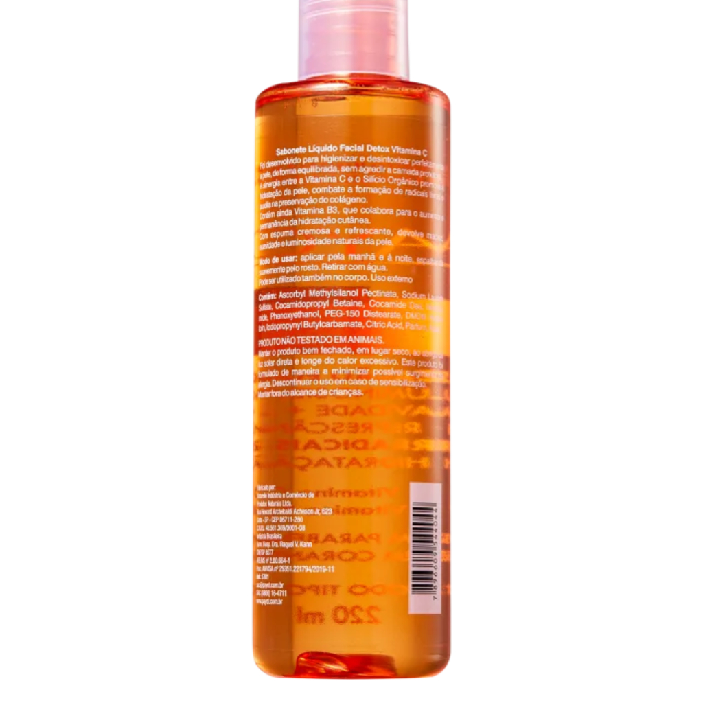 Pele limpa, protegida e cheia de vida! O Sabonete Líquido Facial Payot Detox com Vitamina C foi desenvolvido para quem busca uma limpeza eficaz sem abrir mão do cuidado com a saúde da pele. Sua fórmula avançada combina o poder antioxidante da Vitamina C com agentes de limpeza suaves que removem impurezas, preservam o colágeno e ajudam a proteger contra os danos do dia a dia, como poluição e oleosidade excessiva. Além de limpar profundamente, mantém a hidratação natural da pele, deixando-a macia, luminosa e revitalizada. Ideal para todos os tipos de pele, é perfeito para usar diariamente e deixar o rosto pronto para receber outros cuidados do skincare. Benefícios: Limpeza profunda com ação detox; Ajuda a preservar o colágeno da pele; Previne o envelhecimento precoce; Mantém a hidratação e o viço natural; Indicado para todos os tipos de pele. Modo de uso: Com o rosto úmido, aplique o sabonete e massageie com movimentos suaves até formar espuma. Enxágue bem com água. Use diariamente, pela manhã e à noite.