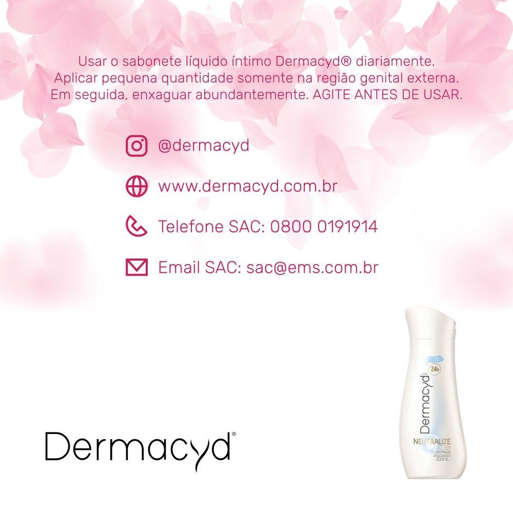 *Produto Original* *Atenção:* Venda exclusiva para pessoa física. Pedidos com CNPJ serão cancelados. Pensando nos desafios e nas necessidades da mulher moderna, o sabonete líquido íntimo Dermacyd Neutralize foi desenvolvido para cuidar da região íntima feminina. Com a tecnologia Odor Control, ele neutraliza possíveis odores, enquanto a fórmula exclusiva pH Equilibrium, com o pH semelhante ao da flora vaginal, limpa sem agredir e mantém as defesas naturais. A sua fórmula hipoalergênica visa ajudar na diminuição dos riscos de alergias, irritações e possíveis odores. Além disso, o sabonete líquido íntimo Dermacyd Neutralize garante sensação de frescor e proteção 24 horas para que você se sinta confiante o dia todo. Dermacyd® pode ser usado diariamente. Em dias de frio, recomenda-se o uso uma vez ao dia. Já nos dias de calor, o ideal é utilizá-lo até 3 vezes ao dia*. Fonte: *Febrasgo | Guia Prático de condutas Higiene genital feminina, 2009.
