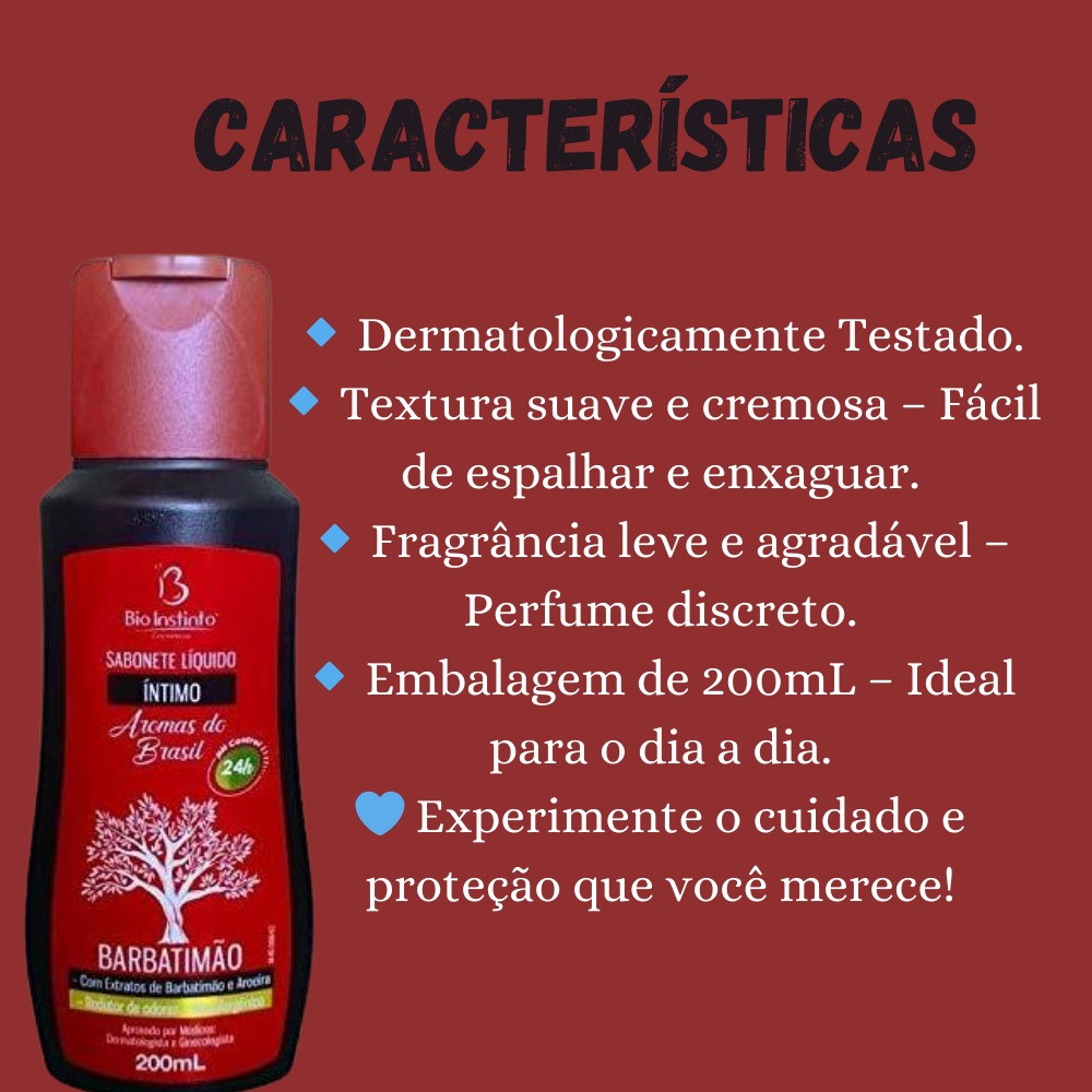 | Sabonete Líquido Íntimo Barbatimão e Aroeira 200ml - Bio Instinto | R$ 6,90 | 15% | 4.9/5 | 5.4 mil |
