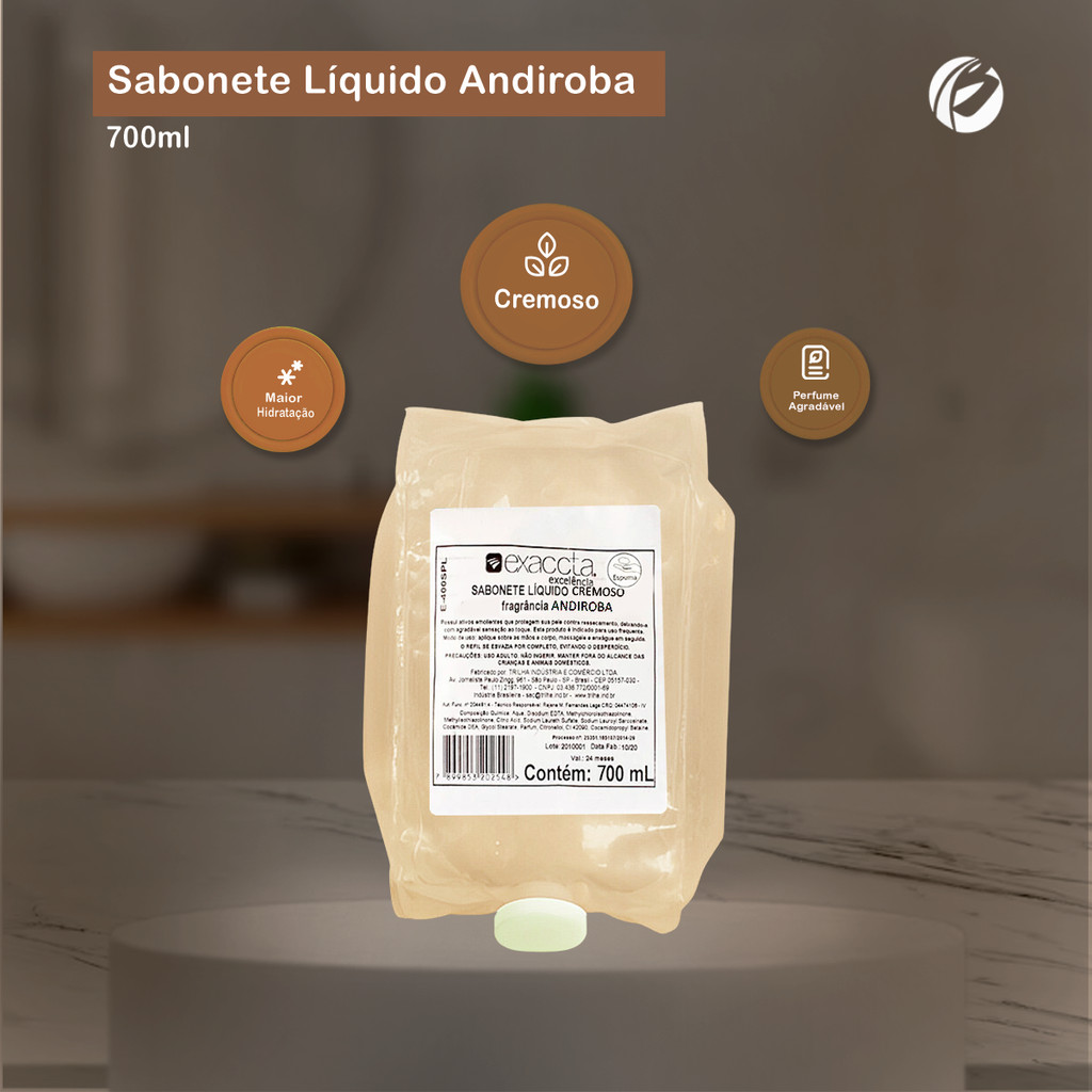 Sabonete Líquido Refil Andiroba 700ml Trilha Possui ativos emolientes com ação protetora, hidratante e calmante. Indicado para ser usado em indústrias, restaurantes, escritórios, clínicas, academias, rodoviárias, salões, colégios, clubes, shoppings e demais estabelecimentos públicos. Produto biodegradável promovendo a limpeza da pele, devolvendo-lhe a umidade e oleosidade natural. Sendo também um excelente produto para uso contínuo. Possui o Sistema de Refil Eco Fácil, facilitando o modo de uso e o descarte, além de proteger o sistema da ventosa contra contaminações. É só retirar e usar. Utilização: Saboneteiras com sistema para refil Eco Fácil de 700 ml com válvula fixa na saboneteira, linha Exaccta Plus ou linha Elisa. Saboneteiras com Válvula Compatíveis: Cód. de Fábrica: SU-20SAB - Saboneteira Líquida com Válvula Branca Exaccta Plus Sustentável Cor: Bege Fragrância: Andiroba Embalagem: 01 Refil com 700ml