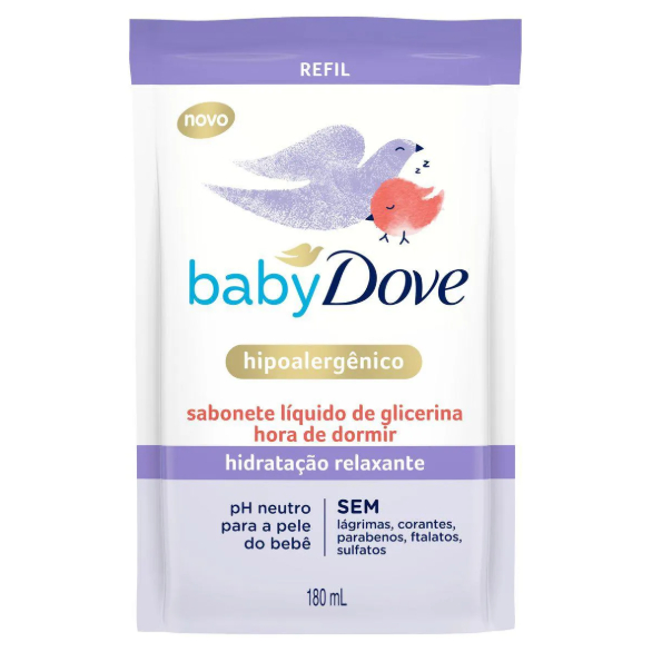 Sabonete Líquido Baby Dove Hora de Dormir Hidratação Relaxante Refil 180ml limpa delicadamente a pele sensível do bebê, promovendo hidratação e relaxamento. Sua fórmula suave, com fragrância calmante, ajuda a preparar o bebê para uma noite tranquila, mantendo a pele macia, protegida e confortável.