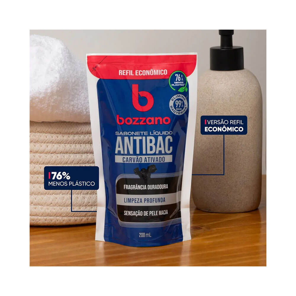 SABONETE LÍQUIDO BOZZANO REFIL ANTIBACTERIANO CARVÃO ATIVO 200ML ================================================================ O Sabonete Líquido Bozzano é formulado para proporcionar uma limpeza profunda e eficaz, eliminando até 99% das bactérias. Com sua composição rica em carvão ativado, ele oferece uma sensação de pele macia e um aroma amadeirado duradouro. Sua fórmula elimina impurezas com eficiência, deixando a pele suave e renovada após cada uso. A embalagem refil reduz drasticamente o uso de plástico, tornando sua rotina de cuidados mais ecológica e prática. LIMPEZA PROFUNDA Sua fórmula elimina impurezas com eficiência, deixando a pele suave e renovada após cada uso. SUSTENTABILIDADE EM DESTAQUE A embalagem refil reduz drasticamente o uso de plástico, tornando sua rotina de cuidados mais ecológica e prática. MODO DE USO =========== Siga estas instruções para uma aplicação eficaz do sabonete líquido. Aplique o sabonete na pele úmida, massageando até formar espuma. Massageie suavemente a pele em movimentos circulares para garantir uma limpeza eficaz. Enxágue completamente com água corrente, removendo todo o produto da pele. Utilize diariamente para manter a pele limpa e protegida contra bactérias. APLICAÇÃO Aplique o sabonete na pele úmida, massageando até formar espuma. MASSAGEM Massageie suavemente a pele em movimentos circulares para garantir uma limpeza eficaz. ENXÁGUE Enxágue completamente com água corrente, removendo todo o produto da pele. USO DIÁRIO Utilize diariamente para manter a pele limpa e protegida contra bactérias. CARACTERÍSTICAS E BENEFÍCIOS DO SABONETE LÍQUIDO BOZZANO ======================================================== Este sabonete líquido antibacteriano é ideal para quem busca uma limpeza profunda, oferecendo frescor prolongado. Elimina até 99% das bactérias com eficácia comprovada em sua fórmula avançada. Purifica a pele absorvendo impurezas e sujeiras de forma eficiente e segura. Perfeito para uso diário no rosto e corpo, garantindo higiene total diariamente. A embalagem refil reduz o desperdício de plástico oferecendo uma solução econômica diária. PROTEÇÃO ANTIBACTERIANA Elimina até 99% das bactérias com eficácia comprovada em sua fórmula avançada. CARVÃO ATIVADO Purifica a pele absorvendo impurezas e sujeiras de forma eficiente e segura. USO VERSÁTIL Perfeito para uso diário no rosto e corpo, garantindo higiene total diariamente. ECONÔMICO E PRÁTICO A embalagem refil reduz o desperdício de plástico oferecendo uma solução econômica diária. ESPECIFICAÇÕES TÉCNICAS ======================= Desenvolvido com tecnologia que combina eficácia na limpeza com cuidados sustentáveis. Cores: Predominantemente azul com detalhes em vermelho e branco. Característica/Ação: Higiene profunda com propriedades antibacterianas. Tipo de Produto: Higiene/Sabonetes. Volume: 200 ml. SOBRE A MARCA BOZZANO ===================== A Bozzano é uma marca renomada no segmento de cuidados pessoais, reconhecida por seus produtos de qualidade. Com uma abordagem focada em inovação e sustentabilidade, os produtos Bozzano oferecem soluções eficazes para o cuidado diário da pele. Produtos desenvolvidos com rigor e qualidade para cuidados eficazes. Comprometida em trazer novas soluções para o mercado de higiene pessoal. Foco em embalagens que reduzem o desperdício e colaboram com o meio ambiente. QUALIDADE RECONHECIDA Produtos desenvolvidos com rigor e qualidade para cuidados eficazes. INOVAÇÃO CONSTANTE Comprometida em trazer novas soluções para o mercado de higiene pessoal. SUSTENTABILIDADE Foco em embalagens que reduzem o desperdício e colaboram com o meio ambiente.