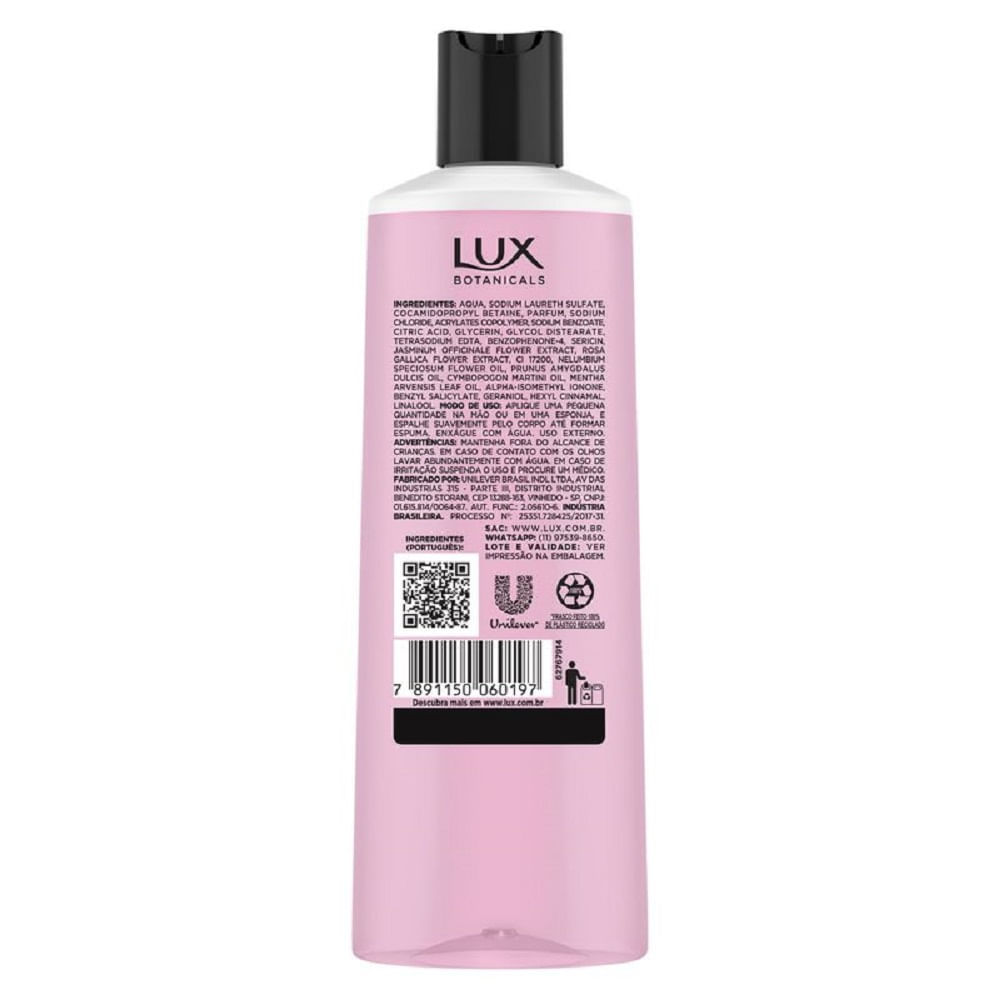 O que é o Lux Botanicals Rosas Francesas? O Sabonete Líquido Lux Botanicals Rosas Francesas é uma combinação sofisticada de ingredientes botânicos naturais e óleos hidraflorais que oferecem uma limpeza suave e perfumada. Sua fórmula exclusiva, com notas florais e frutadas, transforma o banho em um momento de cuidado e bem-estar, deixando a pele macia, hidratada e com toque aveludado. Fragrância botânica do Sabonete Líquido Lux Botanicals Rosas Francesas Notas de topo: Framboesa, Maçã e Pêra. Notas de corpo: Rosa, Violeta e Jasmim. Notas de base: Almíscar e Notas amadeiradas. Para que serve o Refil Sabonete Líquido Lux Botanicals Rosas Francesas? Desenvolvido para o cuidado diário de todos os tipos de pele, o refil do Lux Botanicals Rosas Francesas limpa profundamente sem ressecar, formando uma espuma cremosa que proporciona toque sedoso e sensação de frescor durante o banho. Pode ser utilizado tanto para repor a embalagem original quanto em qualquer dispensador de sabonete líquido. Benefícios e diferenciais Fragrância exclusiva de Rosas Francesas com toque floral sofisticado. Fórmula com óleos hidraflorais e ingredientes botânicos naturais. Proporciona pele macia, suave e aveludada. Indicado para todos os tipos de pele. Ideal para uso diário em todo o corpo. Sem parabenos. Como usar o Lux Botanicals Rosas Francesas? Aplique o Sabonete Líquido Lux Botanicals Rosas Francesas sobre a pele molhada, espalhando com as mãos ou uma esponja até formar espuma. Massageie suavemente e enxágue em seguida com água corrente e abundante. Composição Aqua, Sodium Laureth Sulfate, Sodium Chloride, Cocamide Mea, Parfum, Acrylates Copolymer, Glycerin, Glycol Distearate, Benzophenone-4, Dmdm Hydantoin, Tetrasosium Edta, Bht, Citric Acid, Sodium Hydroxide, Ppg-9, Rosa Gallica Flower Extract, Jasminum Officinale Flower Extract, Prunus Amygdalus Dulcis Oil, Nelumbium Speciosum Flower Oil, Methylchloroisothiazolinone, Hydrolyzed Silk, Mentha Arvensis Leaf Oil, Cymbopogon Martini Oil, Methylisothiazolinone, Ci 17200, Alpha-Isomethyl Ionone, Benzyl Salicylate, Butylphenyl Methylpropional, Geraniol, Hexyl Cinnamal, Linalool. Advertências Uso externo. Não ingerir. Em caso de contato com os olhos, lave imediatamente com água em abundância. Se houver irritação, suspenda o uso e procure orientação médica. Conserve em local fresco, seco e ao abrigo da luz intensa. Mantenha fora do alcance das crianças. Informações Adicionais do Fabricante Sinta na pele até 12 horas de perfume poderoso. Você pode o dia todo! • O Sabonete Líquido Lux Rosas Francesas possui uma delicada fragrância floral que revigora sua pele • Sua fórmula é enriquecida com óleo botânico de beleza, uma mistura de ingredientes naturais que ajudam a manter sua pele macia e suave, proporcionando uma experiência de banho superior • O sabonete líquido corporal Lux Rosas Francesas deixa a sensação de pele macia após o banho • Este sabonete corporal é formulado com uma variedade de ingredientes naturais e é livre de parabenos • O formato garrafa do Sabonete Líquido Corporal Lux Botanicals Rosas Francesas é ideal para o banho proporcionando uma experiência conveniente dentro da caixa Sinta até 12 horas de perfume com o Sabonete Líquido Lux Botanicals Rosas Francesas, diversão de uma experiência de banho superior e uma pele irresistivelmente macia e perfumada, para que você se sinta poderoso o dia todo. O Sabonete Líquido Corporal Lux Botanicals Rosas Francesas é formulado com delicadas notas florais, criando um acorde marcante e conforto um banho de perfume único e especial, além de uma sensação de pele revigorada e macia. Sua fórmula é enriquecida com ingredientes hidratantes, como óleo botânico de beleza, uma mistura de ingredientes naturais como extratos de flores, óleos essenciais e glicerina, deixando a pele suave e ajudando a manter sua hidratação natural. O formato da garrafa do Sabonete Líquido Lux Botanicals Rosas Francesas é feito 100% de plástico reciclado e é ideal para o banho proporcionando uma experiência conveniente dentro da caixa. Modo de uso: Aplique uma pequena quantidade na mão ou em uma esponja, espalhe suavemente pelo corpo até formar espuma e enxágue com água. Experimente também os formatos de sabonete líquido refil e sabonete em barra de Rosas Francesas e conheça as demais fragrâncias: Orquídea Negra, Buquê de Jasmim, Lavanda e Gardênia e Óleo de Amêndoas. Transforme o toque da sua pele com os sabonetes líquidos Lux.
