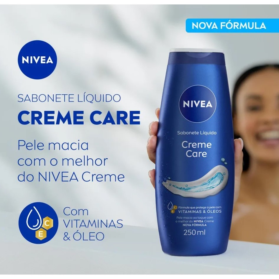 O que é e para que serve o Sabonete Líquido Corporal Nivea Creme Care? Nivea Creme Care é um sabonete líquido corporal ideal para ser utilizado em seu banho diário, oferecendo limpeza e hidratação intensa. Formulado com Eucerit®, ele proporciona cuidado completo, mantendo a pele saudável. Além de higienizar, ele hidrata e suaviza a pele, deixando-a macia e revigorada, além de suavemente perfumada. A fragrância exclusiva Nivea Sabonete Líquido Creme Care proporciona uma experiência sensorial única. Dermatologicamente testado, o sabonete é seguro e eficaz. Um cuidado diário essencial para uma pele radiante e bem-cuidada. Cuide da sua pele com NIVEA Creme Care e sinta a diferença. Disponível em embalagem de 250ml que rende até 60 banhos. Benefícios do Sabonete Líquido Nivea Creme Care Limpa delicadamente e hidrata a pele. Deixa a pele macia e suavemente perfumada. Proporciona uma espuma cremosa e agradável durante o banho. Em equilíbrio com o pH da pele. Ingredientes e fragrância únicos de NIVEA creme. Dermatologicamente testado. Como usar o Sabonete Líquido Nivea Creme Care? Aplique o Sabonete Líquido Nivea Creme Care por todo o corpo, massageando suavemente até formar uma espuma cremosa. Enxágue totalmente. Ingredientes Aqua, Sodium Laureth Sulfate, Cocamidopropyl Betaine, Sodium Chloride, Lanolin Alcohol, Panthenol, Octyldodecanol, Pantolactone, Glycerin, PEG-3 Distearate, PEG-7 Glyceryl Cocoate, PEG-200 Hydrogenated Glyceryl Palmate, PEG-40 Hydrogenated Castor Oil, Citric Acid, Trisodium EDTA, Sodium Benzoate, DMDM Hydantoin, Methylisothiazolinone, BHT, Linalool, d-Limonene, Geraniol, Citronellol, Alpha-Isomethyl Ionone, Methyl Benzoate, Parfum. A lista de ingredientes usados na composição pode ser alterada pelo fabricante. Desta forma, recomendamos que você sempre leia a lista de ingredientes na embalagem do produto para garantir que são adequados para seu uso. Advertências Uso externo. Não ingerir. Caso haja contato com os olhos, lave-os abundantemente. Se houver irritação, suspenda o uso imediatamente e procure orientação médica. Mantenha fora do alcance das crianças.