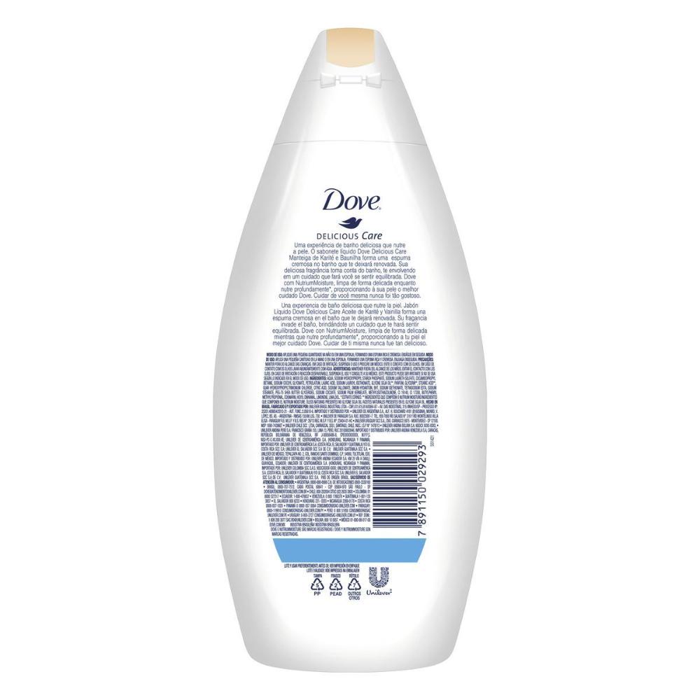 Possui Nutrium Moisture, nossa mistura única de hidratantes que ajuda a nutrir a sua pele deixando-a macia e suave. Fórmula cremosa, rica e suave que não agride a pele. Pode ser usado diariamente. Pele macia e mais bonita todos os dias. Limpeza eficaz, ajuda a proteger a camada protetora da pele. Deliciosa fragrância de manteiga de karité e baunilha. Nós sabemos que às vezes você precisa de um tempinho só para você. O chuveiro é um ótimo lugar para ter um momento consigo mesma e, com o sabonete líquido certo, também pode ser um lugar para cuidar da sua pele. É por isso que apresentamos o Sabonete Líquido Dove Delicious Care Karité e Baunilha, um de nossos melhores sabonetes líquidos hidratantes, que te faz relaxar e cuida da sua pele. Os benefícios hidratantes para a pele da manteiga de karité já são bastante conhecidos, é por isso que a adicionamos ao Sabonete Líquido Dove Delicious Care Karité e Baunilha. Esse sabonete líquido te envolve em uma espuma rica e cremosa, com uma deliciosa fragrância de manteiga de karité e baunilha, uma experiência que vai fazer com que você se sinta relaxada. Além disso, a fórmula suave do sabonete é enriquecida com Nutrium Moisture, nossa mistura única de hidratantes que ajuda a nutrir a sua pele deixando-a macia e suave. Para uma melhor experiência de uso e rendimento do produto, sugerimos as seguintes formas de uso: - Apenas um pouco do produto na esponja é capaz de lavar o corpo inteiro; - Banho com esponja: Colocar uma pequena quantidade de produto na esponja (5ml) e passar suavemente pelo corpo; - Banho sem esponja: Aplicar uma pequena quantidade de produto nas mãos, fora da água, fazer a espuma e aplicar no corpo. Você pode ser fã do Sabonete Líquido Dove Delicious Care Karité e Baunilha, mas com tantas opções, por que não experimentar todos? Afinal, temos um sabonete para cada momento.