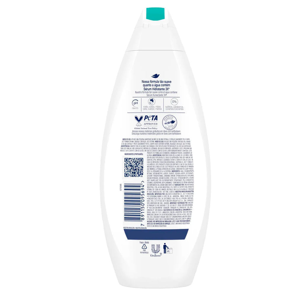 • O Sabonete Líquido Dove Pele Sensível contém Sérum Hidratante 3x* para uma pele mais macia e bem cuidada • Dove Pele Sensível contém pH neutro, não interferindo no próprio pH da pele e ajudando a manter sua barreira de proteção natural • A fórmula deste sabão líquido não contém parabenos, sulfatos e alergênicos, podendo ser usado diariamente até para as peles mais sensíveis • O Sabonete Líquido Dove Pele Sensível ajuda na hidratação da pele, possui pois uma fórmula rica em sabonetes hidratantes, como a glicerina • Com agentes líquidos de limpeza suave, estes sabonetes deixam sua pele macia, ingredientes bonitos e com aspecto saudável • O Sabonete Líquido Dove Pele Sensível é hipoalergênico e dermatologicamente testado. Os sabonetes líquidos Dove vão além da limpeza, nutrindo a pele enquanto remove a sujeira do dia a dia. Acreditamos que o segredo para uma pele bonita é a hidratação diária, por isso o sabonete Dove Pele Sensível combina uma fórmula de limpeza suave com glicerina e Sérum Hidratante 3x*, deixando sua pele mais macia, bem cuidada e com uma aparência saudável. Dove Pele Sensível contém pH neutro, não interfere no próprio pH da pele e ajuda a manter sua barreira de proteção natural. Este sabão líquido Dove possui características suaves e fórmula hipoalergênica. Com 0% sulfatos, parabenos e alergênicos, este sabonete é tão suave quanto a água, para cuidar até das peles mais sensíveis. Você pode usá-lo diariamente para manter seu rosto, mãos e corpo limpos e macios. Para uma melhor experiência no banho, sugerimos o seguinte modo de uso: aplique uma pequena quantidade na mão ou em uma esponja, espalhe suavemente pelo corpo até formar espuma e, por último, enxágue com água morna. O Sabonete Dove Pele Sensível não vai deixar a sua pele seca e áspera como os sabonetes comuns fazem. Este sabonete é dermatologicamente testado e hipoalergênico. Dove é certificada Cruelty-Free pela PETA, sendo assim, não realizamos e nem realizamos testes em animais em nenhum lugar do mundo. *Componentes do sérum hidratantes 3x.