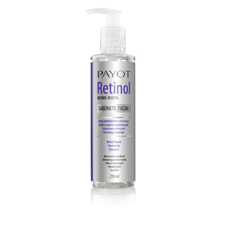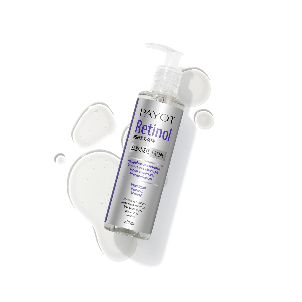 O Sabonete Facial Retinol Payot limpa profundamente sem ressecar a pele. Sua fórmula revitalizante minimiza aoleosidade. Mantém a pele macia e iluminada ao longo do dia. A combinação de RETINOL VEGETAL, NIACINAMIDA E VITAMINA E ajuda a hidratar, proteger e promover a aparência de uma pele renovada. Possui uma textura leve e espuma cremosa. Produto livre de parabenos e corantes. Utilizamos um ativo de origem vegetal (Phyto-Retinol), que não possui os efeitos adversos do retinol tradicional. Hipoalergênico. Produto Vegano. Não Testado em animais. Sem corantes e parabenos. Dermartologicamente testado. Indicação: Todos os tipos de pele. Modo de Uso: Diariamente pela manhã e à noite, aplicar no rosto úmido massageando em movimentos circulares. Enxágue em abundância. Uso externo. Ingredientes: Água, Lauriéter Sulfato de Sódio, Cocoamidopropilbetaína, Diolamida de Coco, Propanodiol, Dioleato de Metilglicose Etoxilada (120OE), Polissorbato 20, Perfume (Salicilato de Benzila, Hexil Cinamal), Fenoxietanol, Nicotinamida, Óleo da Semente de Linho, Óleo da Semente de Algodão, Caprililglicol, Edetato Dissódico, Acetato de Tocoferila, Extrato de Bidens Pilosa, Óleo de Palma, Ácido Cítrico. Composição: Água, Lauriéter Sulfato de Sódio, Cocoamidopropilbetaína, Diolamida de Coco, Propanodiol, Dioleato de Metilglicose Etoxilada (120OE), Polissorbato 20, Perfume (Salicilato de Benzila, Hexil Cinamal), Fenoxietanol, Nicotinamida, Óleo da Semente de Linho, Óleo da Semente de Algodão, Caprililglicol, Edetato Dissódico, Acetato de Tocoferila, Extrato de Bidens Pilosa, Óleo de Palma, Ácido Cítrico. Precauções: Manter o produto bem fechado, em lugar seco, ao abrigo da luz direta e longe do calor excessivo. Este produto foi formulado de maneira a minimizar possível surgimento de alergia. Descontinuar o uso em caso de sensibilização. Manter fora do alcance de crianças.