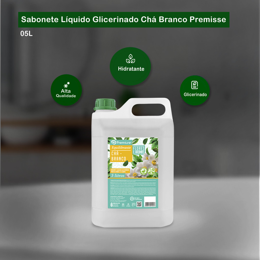 Sabonete Líquido Glicerinado Chá Branco 5L Premisse É uma excelente opção para quem busca higiene, suavidade e economia em um só produto. Este sabonete foi criado para atender tanto o uso diário em residências quanto a demanda de ambientes comerciais e institucionais, como empresas, escolas, clínicas, academias, hotéis e restaurantes. Possui um PH balanceado e por esse motivo não agride a pele, oferecendo hidratação e cuidado para todos os tipos de pele! Indicação de Uso: - Pode ser utilizado nas mãos, rosto e corpo. Cor: Branco Fragrância: Chá Branco Embalagem: 01 Galão de 5L