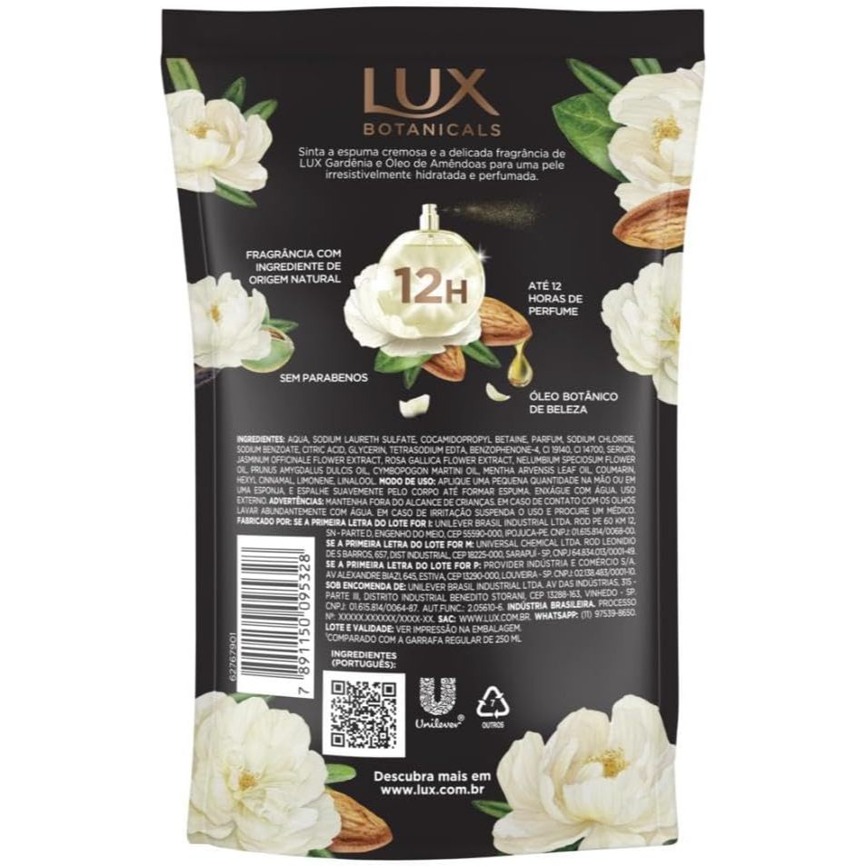 Sabonete Líquido Lux Botanicals Gardênia E Óleo De Amêndoas Com 200ml Principais Características: • Fórmula suave com extratos de Gardênia e Óleo de Amêndoas, que hidratam e cuidam da pele. • Textura líquida que proporciona espuma cremosa para uma limpeza delicada. • Fragrância refinada, deixando a pele perfumada e sensação de frescor. Benefícios: • Mantém a pele macia, hidratada e perfumada após o uso. • Limpeza eficiente sem ressecar a pele. • Ideal para uso diário, promovendo bem-estar durante o banho. Diferenciais do Produto: • Combinação de ingredientes botânicos que cuidam e protegem a pele. • Aroma exclusivo que oferece uma experiência sensorial agradável. • Fácil aplicação graças à sua textura líquida e cremosa. Especificações Técnicas: • Peso: 200ml Instruções de Uso: • Aplicar sobre a pele úmida, massageando suavemente até formar espuma. • Enxaguar completamente. Avisos e Precauções: • Uso externo. • Evitar contato com os olhos. • Manter fora do alcance de crianças. O que está incluso? • 1 Sabonete Líquido Lux Botanicals Gardênia E Óleo De Amêndoas 200ml ---- DÚVIDAS FREQUENTES ---- Os produtos são originais? Sim. Todos os nossos produtos são originais. Emitem nota fiscal? Sim. Emitimos nota fiscal para todos os pedidos.