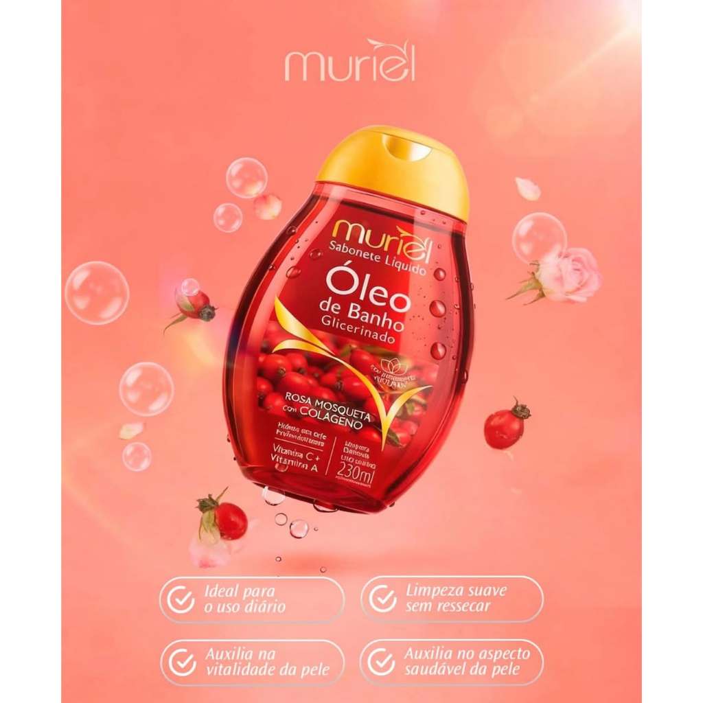 Amêndoas com Avelã: O Óleo de Banho Glicerinado Muriel Amêndoa com Avelã combina hidratação intensa com ação nutritiva, ideal para cuidar da pele durante o banho. Sua fórmula glicerinada, enriquecida com óleos de amêndoa e avelã, forma uma barreira protetora que retém a umidade natural da pele e proporciona maciez duradoura. Árabe: O Óleo de Banho Glicerinado Muriel Árabe Argan e Mirra une tradição e sofisticação para cuidar da sua pele com suavidade e eficácia. Enriquecido com óleo de argan e extrato de mirra, sua fórmula glicerinada promove hidratação intensa, nutrição profunda e ação antioxidante durante o banho. Pistache com Colágeno: O Óleo de Banho Glicerinado Muriel Pistache com Colágeno oferece hidratação intensa com um toque nutritivo e revitalizante durante o banho. Sua fórmula enriquecida com colágeno e extrato de pistache ajuda a preservar a firmeza da pele enquanto forma uma película protetora que evita o ressecamento. Amêndoas com Colágeno: O Óleo de Banho Glicerinado Muriel Amêndoa com Colágeno oferece hidratação profunda já durante o banho, combinando o poder nutritivo do óleo de amêndoas com a ação firmadora do colágeno. Sua fórmula glicerinada limpa suavemente e ajuda a preservar a elasticidade natural da pele. Cereja com Colágeno: O Óleo de Banho Glicerinado Muriel Elixir de Cereja com Colágeno combina hidratação profunda com ação revitalizante e uma fragrância frutada envolvente. Sua fórmula glicerinada, enriquecida com colágeno e extrato de cereja, ajuda a preservar a elasticidade da pele enquanto promove nutrição e maciez já durante o banho. Romã Care: O Óleo de Banho Glicerinado Muriel Romã Care proporciona uma limpeza delicada com hidratação intensa já durante o banho. Sua fórmula enriquecida com glicerina vegetal e extrato de romã limpa suavemente enquanto forma uma película protetora que mantém a umidade natural da pele. Rosa Mosqueta: O Óleo de Banho Glicerinado Muriel Rosa Mosqueta com Colágeno promove uma hidratação profunda com ação restauradora, ideal para cuidados diários com a pele durante o banho. Sua fórmula rica em rosa mosqueta e colágeno contribui para a regeneração da pele, ajudando a manter sua firmeza e elasticidade natural. Gourmand Gold: O Óleo de Banho Glicerinado Muriel Gourmand Gold entrega uma experiência luxuosa de hidratação e cuidado durante o banho. Com fórmula glicerinada e textura leve, limpa suavemente enquanto forma uma película protetora que ajuda a manter a umidade natural da pele. ENVIO IMEDIATO!