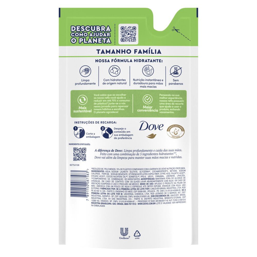 • O Sabonete Líquido para as Mãos Dove Nutrição Profunda Refil fornece nutrição instantânea e duradoura para mãos mais macias • Sabão líquido para mãos que limpa profundamente em segundos e hidrata por horas • O Sabonete Líquido para as Mãos Dove Nutrição Profunda Refil é feito com uma combinação de 5 ingredientes hidratantes, pois Dove vai além da limpeza para deixar suas mãos macias e nutridas • Este sabonete líquido é dermatologicamente testado • O Sabonete Líquido para as Mãos Dove Nutrição Profunda Refil é feito com hidratantes de origem natural e sem parabenos, para uma limpeza profunda de verdade • O Sabonete Líquido Dove Nutrição Profunda Refil possui embalagem feita com 70% menos plástico* Você costuma se perguntar sobre como deixar sua pele sempre macia? Com o sabonete líquido correto você pode cuidar da pele das suas mãos, hidratando-a todos os dias e protegendo-a contra o ressecamento. O Sabonete Líquido para as Mãos Dove Nutrição Profunda Refil é suave e hidratante, ajudando a sua pele a manter sua hidratação natural enquanto você higieniza suas mãos. Ele limpa e nutre a pele, além de te fazer relaxar com uma deliciosa fórmula hidratante. O Sabonete Líquido para as Mãos Dove Nutrição Profunda Refil é feito com uma combinação de 5 ingredientes hidratantes, pois Dove vai além da limpeza para deixar suas mãos macias e nutridas. Este sabonete líquido Dove fornece nutrição instantânea e duradoura para mãos mais macias, além de ser dermatologicamente testado. O Sabonete Líquido para as Mãos Dove Nutrição Profunda Refil limpa cuidadosamente e é feito com hidratantes de origem natural e sem parabenos, para uma limpeza profunda de verdade. A embalagem do sabonete líquido Dove refil é feita com 70% menos plástico*, além de ser mais econômica para o seu bolso. Leve mais, pague menos. Você pode ser fã do Sabonete Líquido para as Mãos Dove Nutrição Profunda Refil, mas com tantas opções, por que não experimentar todos? Afinal, temos um sabonete para cada momento. Acreditamos que a beleza deve ser uma fonte de confiança, não de ansiedade. É por isso que estamos aqui para ajudar mulheres do mundo todo a desenvolverem uma relação positiva com sua aparência, ajudando-as a aumentar sua autoestima e perceber todo seu potencial. *Redução de, pelo menos, 70% de plástico comparado com a embalagem original.