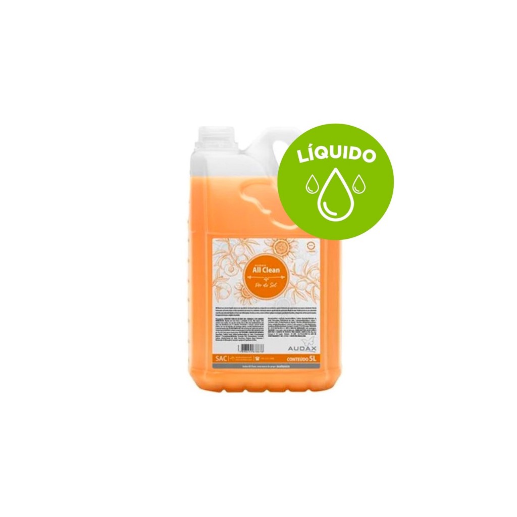 Sabonete Líquido Por do Sol 5L All Clean All Clean é um sabonete líquido cremoso, enriquecido com emolientes e agentes hidratantes que proporcionam uma espuma abundante. Fórmula balanceada e PH neutro, limpas as mãos sem ressecá-las, mantendo a hidratação natural e agradavelmente perfumada. Cor: Laranja Fragrância: Por do Sol (Antigo Pêssego) Embalagem: 1 Galão de 5 litros cada
