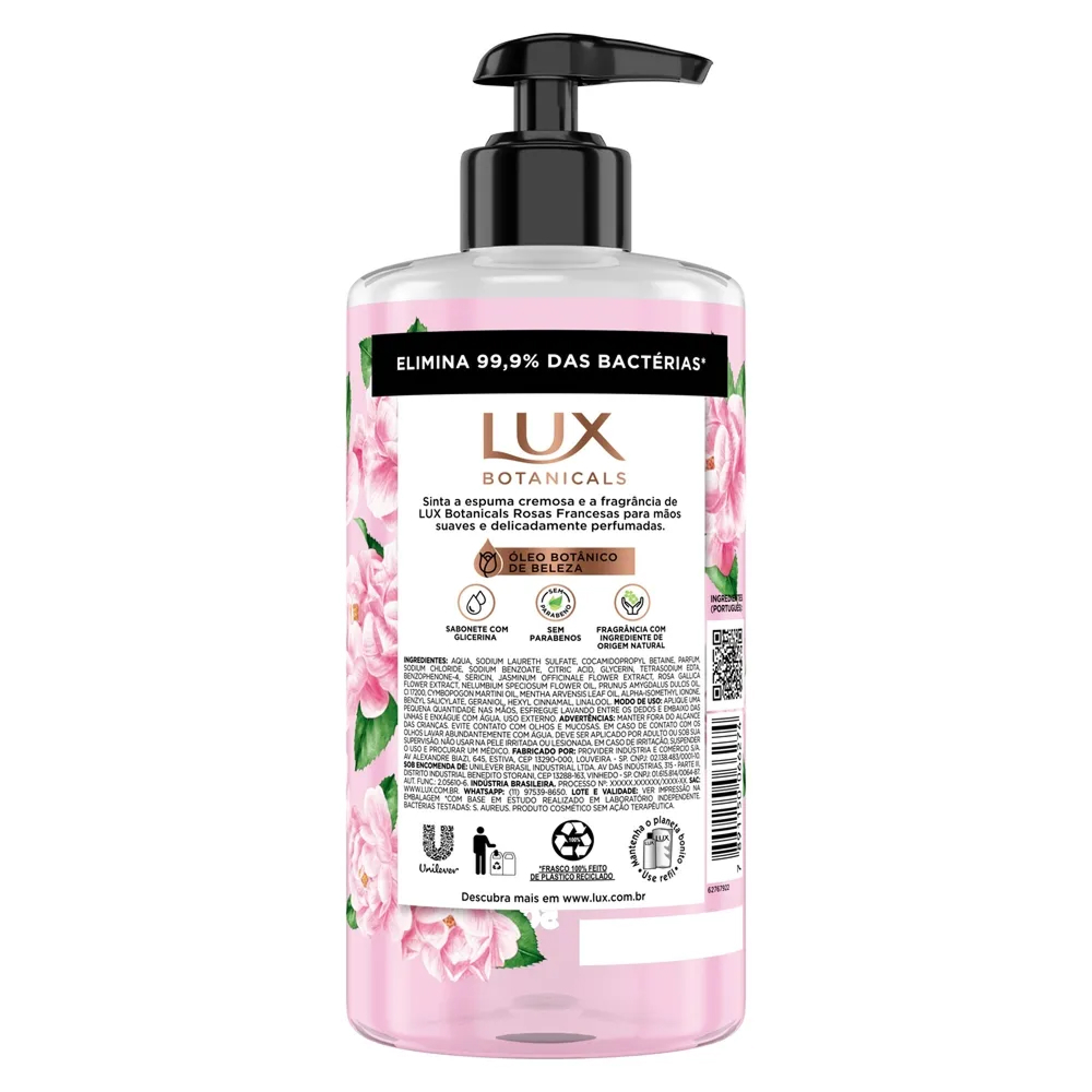 Sabonete Lux Liquido Mãos Rosas Francesas 500ml Principais Características: • Fórmula enriquecida com extrato de Rosas Francesas, que proporciona uma fragrância delicada e marcante. • Textura cremosa que limpa suavemente sem agredir a pele. • Embalagem com válvula pump, prática e econômica para o uso diário. Benefícios: • Limpeza eficaz com sensação prolongada de frescor e suavidade. • Perfuma as mãos de forma suave e elegante. • Ideal para uso constante sem ressecar a pele. Diferenciais do Produto: • Desenvolvido com ingredientes inspirados na natureza e fragrância criada por perfumistas internacionais. • Indicado para todos os tipos de pele. • Produto dermatologicamente testado. Especificações Técnicas: • Peso: 500ml Instruções de Uso: • Aplique uma pequena quantidade nas mãos molhadas. • Esfregue até formar espuma abundante e enxágue bem. • Uso externo. Avisos e Precauções: • Evite contato com os olhos. • Em caso de irritação, suspenda o uso e procure orientação médica. • Mantenha fora do alcance de crianças. O que está incluso? • 1 unidade de Sabonete Lux Liquido Mãos Rosas Francesas 500ml ---- DÚVIDAS FREQUENTES ---- Os produtos são originais? Sim. Todos os nossos produtos são originais. Emitem nota fiscal? Sim. Emitimos nota fiscal para todos os pedidos.