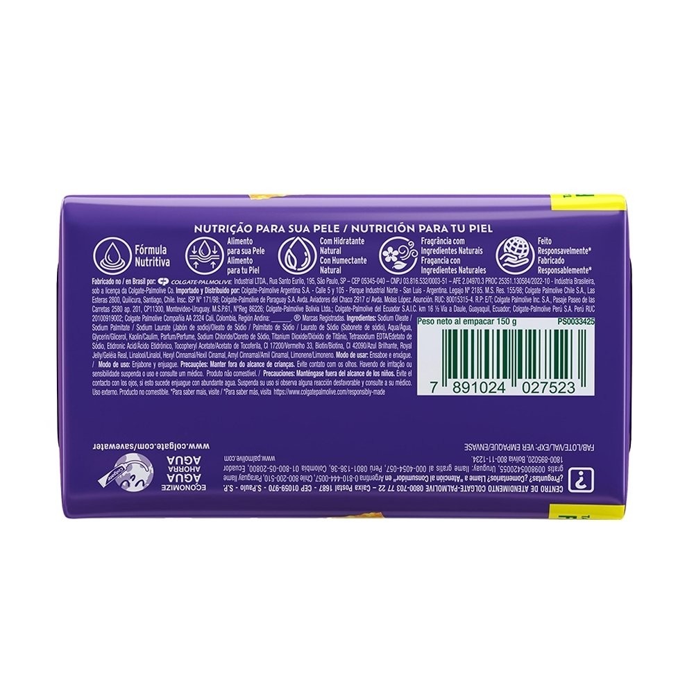 Características do Produto: Marca: Palmolive Linha: Naturals Segmento: Sabonete em barra Dimensões: Altura: 10cm Largura: 6,2cm Profundidade: 3,5cm Peso: Peso bruto: 154g Composição : Sodium palmitate / sodium oleate / sodium laurate (jabón de sodio), aqua, glycerin, talc, parfum, sodium chloride, titanium dioxide (CI 77891), red 33 (CI 17200), etidronic acid, pentasodium pentetate, blue 1 (CI 42090), silk, amino acids, royal jelly, amyl cinnamal, hexyl cinnamal, limonene. Modo de Uso : Molhar o corpo ou a região desejada, ensaboar normalmente e enxaguar. Fornecedor: Palmolive