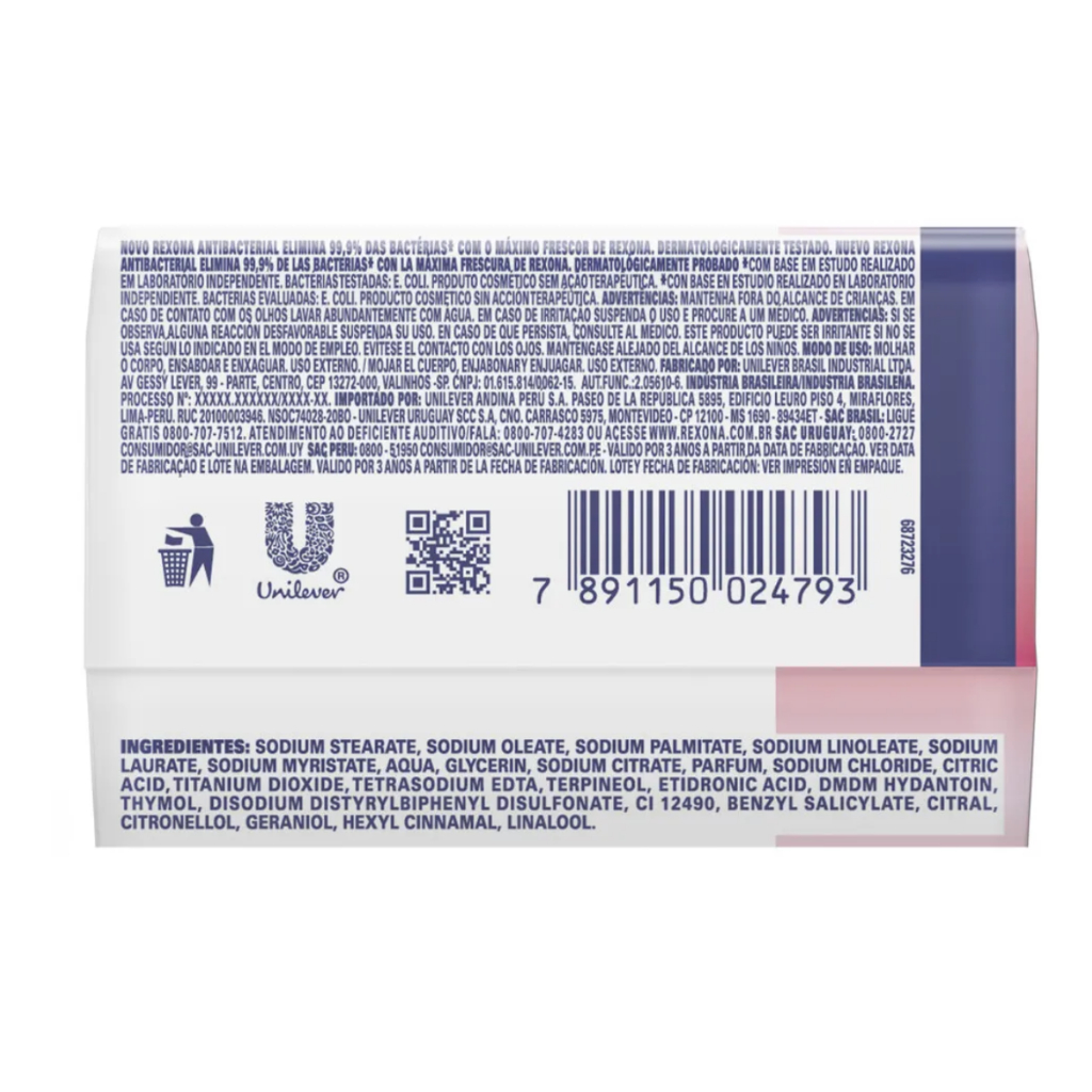 Sabonete Rexona em Barra Antibacterial Orchid 84g O Sabonete Rexona Antibacterial Orchid proporciona uma limpeza profunda e eficaz, eliminando até 99,9% das bactérias. Com uma fragrância floral marcante e refrescante, ele garante sensação de frescor prolongada, além de oferecer proteção para a pele ao longo do dia. Principais Características - Proteção Antibacteriana: Elimina até 99,9% das bactérias, proporcionando higiene e cuidado. - Fragrância Floral Orchid: Perfume suave e duradouro para uma sensação prolongada de frescor. - Fórmula Hidratante: Limpa sem ressecar, mantendo a pele macia e saudável. Benefícios - Higiene eficaz com proteção antibacteriana. - Perfume floral delicado e sensação de frescor o dia todo. - Ideal para uso diário em todos os tipos de pele. Diferenciais do Produto - Tecnologia Rexona Antibacterial que combate as bactérias sem agredir a pele. - Espuma cremosa que proporciona um banho agradável e revigorante. - Desenvolvido para quem busca proteção e cuidado com a pele no dia a dia. Especificações Técnicas - Peso: 84g - Tipo: Sabonete em barra antibacteriano Instruções de Uso - Aplique o sabonete sobre a pele molhada. - Massageie suavemente até formar espuma. - Enxágue completamente com água. - Para melhores resultados, utilize diariamente. Avisos e Precauções - Uso externo. - Evite contato com os olhos. Caso isso ocorra, enxágue com água em abundância. - Mantenha fora do alcance de crianças. - Conservar em local seco e fresco. O que está incluso - 1 Sabonete Rexona Antibacterial Orchid 84g ---- Dúvidas Frequentes ---- Os produtos são originais? Sim. Todos os nossos produtos são originais. Emitem nota fiscal? Sim. Emitimos nota fiscal para todos os pedidos.