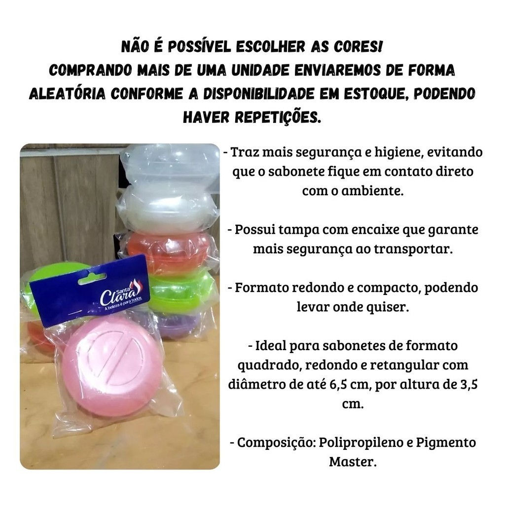Saboneteira Redonda Translúcida Porta Sabonete Santa Clara A Saboneteira Redonda Translúcida da Santa Clara é ideal para armazenar um item essencial da nossa higiene diária, além disso garante mais segurança e evita que o sabonete entre em contato com bactérias que existem no ambiente, sua forma compacta permite que você leve ela sempre onde desejar, garantindo a você mais segurança e higiene. Características - Saboneteira translúcida - Formato Arredondado - Tampa com Encaixe - Não possui frestas para saída de líquido - Composição: Polipropileno e Pigmento Master Benefícios - Garante para você cliente mais segurança para realizar o transporte do seu sabonete - Permite evitar o contato dele com o ambiente, mantendo seu sabonete sempre limpo e seguro - Traz mais conforto e praticidade em seu manuseio Observações - O que é Translúcido ? Que deixa passar a luz, não permitindo que se vejam nitidamente os objetos através de sua espessura