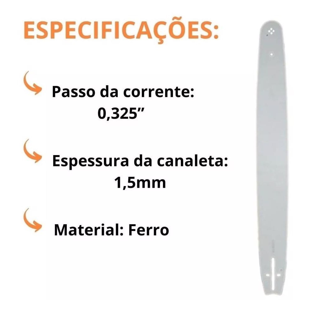 Distribuído Por: Rei das Ferramentas e Máquinas. Sabre Para Motosserra a Gasolina Os sabres também conhecidos como barras são acessórios utilizados para os trabalhos de poda de árvores, cortes em madeira e atividades de manutenção e marcenaria em geral. Especificações: • Material: Ferro • Passo da corrente: 0,325” • Espessura da canaleta: 1,5mm • Ponta: rolante • Tamanho do sabre: 20 polegadas Conteúdo da Embalagem: - 01 Sabre 20 Polegadas Para Motosserra A Gasolina Evald