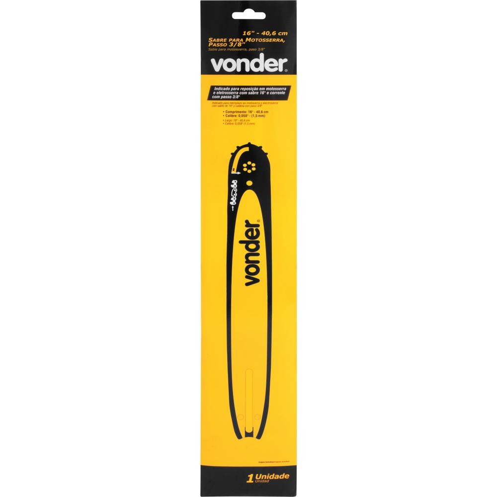 Marca: Vonder Conteúdo da Embalagem: 1 Sabre Aplicações e dicas de uso: Indicado para reposição em motosserra e eletrosserra com sabre 16'' e corrente com passo 3/8" Características Técnicas: Comprimento do sabre: 16" - 40,6 cm Calibre do sabre: 0.058"(1,5 mm)