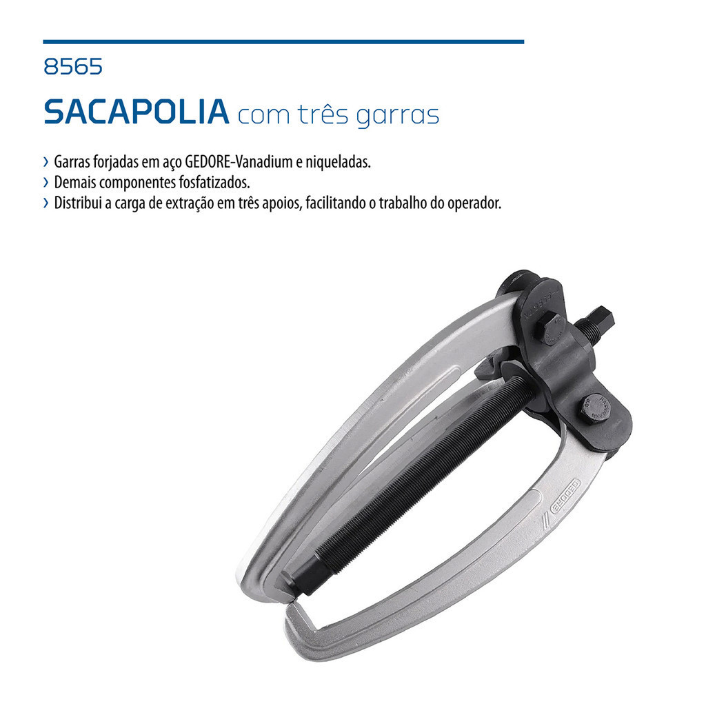 Saca Polia com 3 Garras 8565-4 Gedore 7,5 ton. Descrição: - Garras e ponteira em aço Gedore-Vanadium, demais componentes em aço especial; - Garras com acabamento niquelado e demais componentes escurecidos; - Distribui a carga de extração em três apoios, facilitando o trabalho do operador. Dicas de segurança: - Sempre utilize o sacapolia correspondente ao diâmetro da polia a ser extraída, para que não danifique a polia e o sacapolia; - Posicione adequadamente as garras do sacapolia de forma equidistante, isto facilitará a extração e tornará a operação mais segura; - Respeite o limite de carga operacional estabelecido para cada sacapolia. Dados Técnicos: - Marca: Gedore; - Modelo: 040060; - Referência: 8565-4; - Altura máxima útil das garras: 170mm; - Profundidade útil de trabalho das garras: 21mm; - Abertura máxima útil de trabalho das garras: 80mm; - Abertura máxima das garras: 220mm; - Curso do fuso: 240mm; - Diâmetro do fuso: 17mm; - Capacidade de força operacional: 7,5 ton.; - Peso: 4,2 Kg. Componentes Inclusos: - 01 Saca Polia com 3 Garras 8565-4 Gedore.