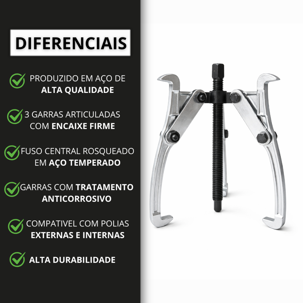 PRONTA ENTREGA | DESPACHAMOS SEU PEDIDO EM ATÉ 24 HORAS! O Saca Polia com 3 Garras é a ferramenta ideal para quem busca segurança, precisão e eficiência na remoção de polias, rolamentos e engrenagens, sem danificar as peças ou o eixo. Fabricado em aço de alta resistência, possui 3 garras articuladas que garantem melhor distribuição da força, proporcionando uma extração firme, estável e controlada, mesmo em aplicações mais exigentes. PRINCIPAIS APLICAÇÕES - Remoção de polias - Retirada de rolamentos - Extração de engrenagens - Motores elétricos - Ventiladores, compressores e máquinas em geral DIFERENCIAIS DO PRODUTO - Sistema de 3 garras: mais estabilidade e segurança - Garras ajustáveis que se adaptam a diferentes diâmetros - Fuso central reforçado, com rosca precisa - Reduz o risco de danos às peças removidas - Ideal para uso profissional e doméstico DISPONÍVEL EM 4 TAMANHOS: - 3 Polegadas - 75mm de abertura - 4 Polegadas - 100mm de abertura - 6 Polegadas - 150mm de abertura - 10 Polegadas - 250mm de abertura Dúvidas? Fale com a gente aqui no chat. Atendimento rápido! Agradecemos sua preferência. Boas compras!