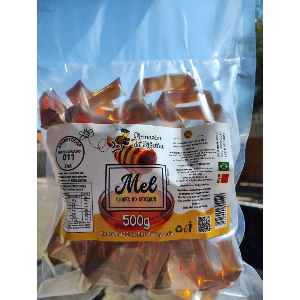 ENVIO IMEDIATO! Contém 125 sachês de 4 gramas cada. OBS: Pode ter uma variação na gramatura dos sachês, tornado o pacote de meio kg com 115 a 125 sachês. Falou em mel puro, falou em mel do Armazém da Abelha. Há 10 anos no mercado entregando o melhor em produtos das abelhas para você e sua família. Mel oriundo de flores do cerrado, extraido e envazado artesanalmente, trazendo o mínimo de processamento para manter as propriedades do mel, mantrendo a alta qualidade. Produto certificado pelo SIM (Sistema de Inspeção Municipal), que confere ao nosso produto a garantia de sanidade. Todo o processo é feito por agricultura familiar, desde a produção nos apiários, até a colheita, processamento e venda. Consuma Mel! Assim você ajuda a preservar o meio ambiente e as abelhas! Aguardamos o seu pedido. Dúvidas? Aguardamos o seu contato.